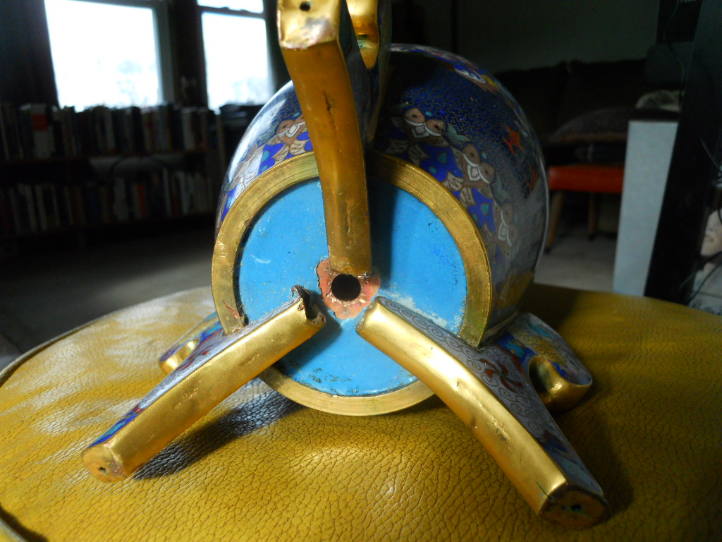 the pics tell most of what I know. someone made it into a lamp in the 1960's, the hole sure looks like copper. It came from a wealthy family who had it at least since the 60's. Condition looks really good to me. Searching I could not find anything with feet like this or a simalar pattern. My reasearch has taught me it is really hard to date Cloisonne... :(
