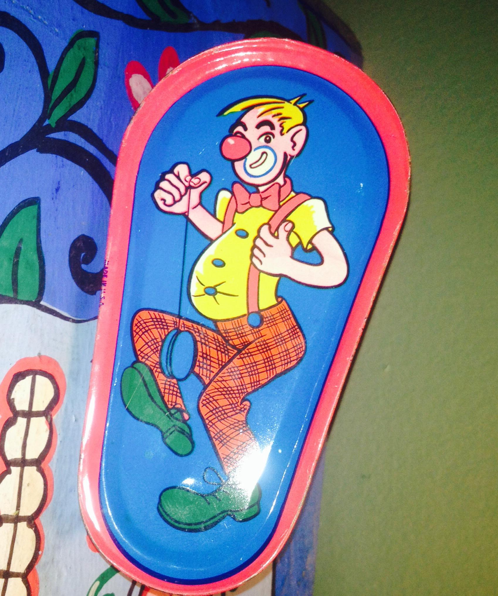 Vintage metal or tin party noise maker with Clown on front. Is blue in color with red outline with yellow crank on back to make noise. It's in really good condition. Has "Made in America" printed on one side and on the other says "Kirchnof? Life Of The Part Products." Found at a local flea market.