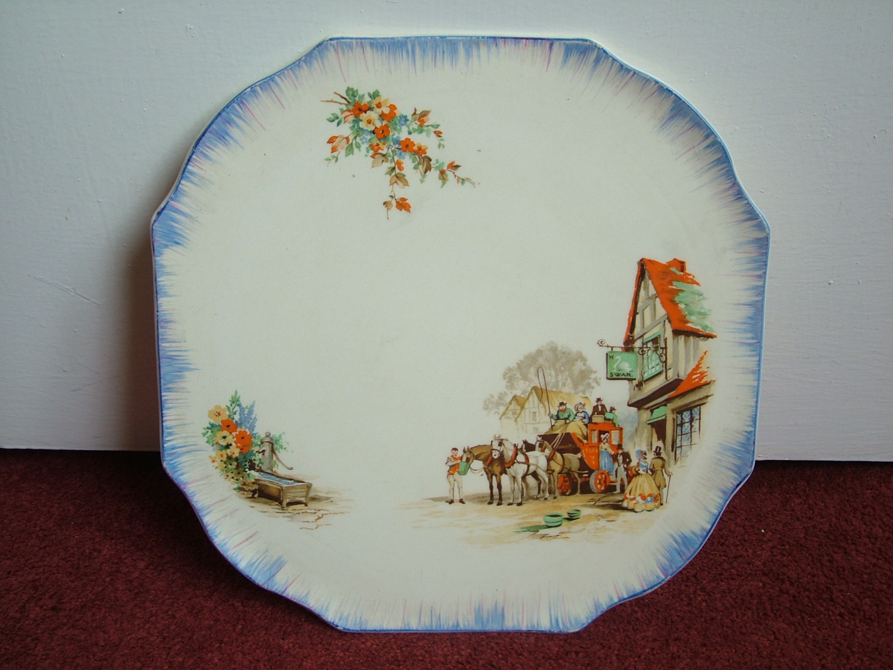 it is a flat plate 11x11 inches (square/cut off corners cream body with blue/pink inward brushed edge.