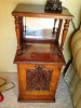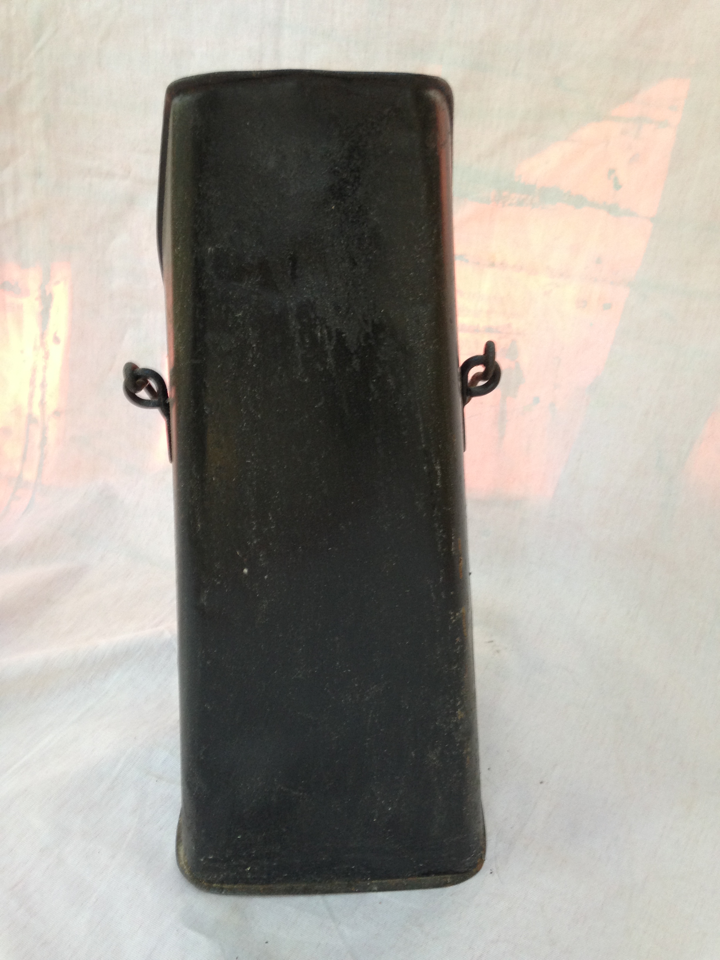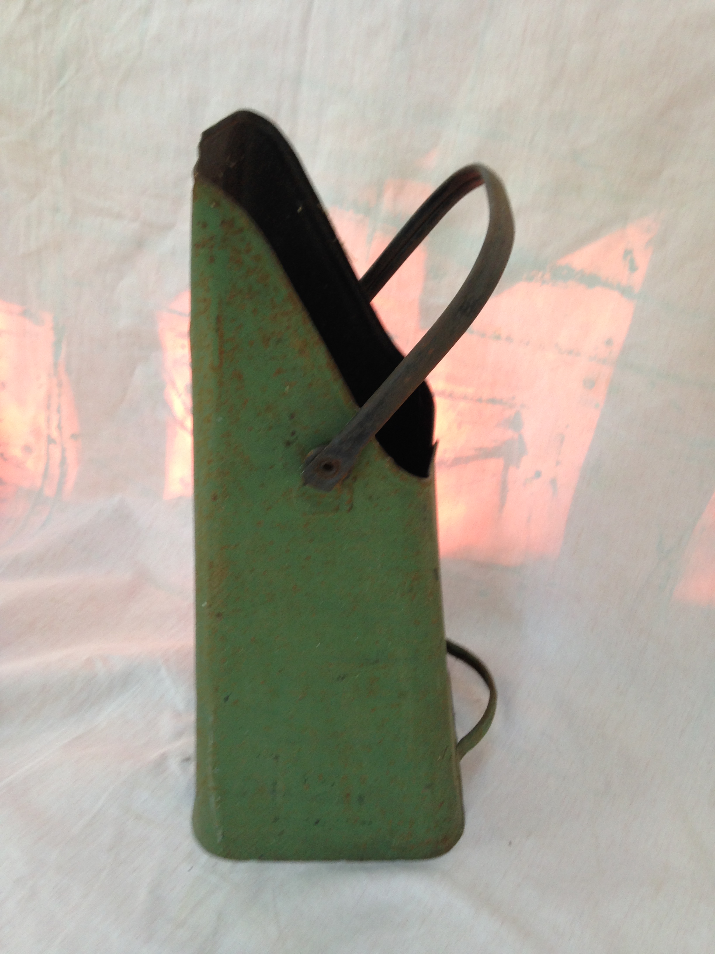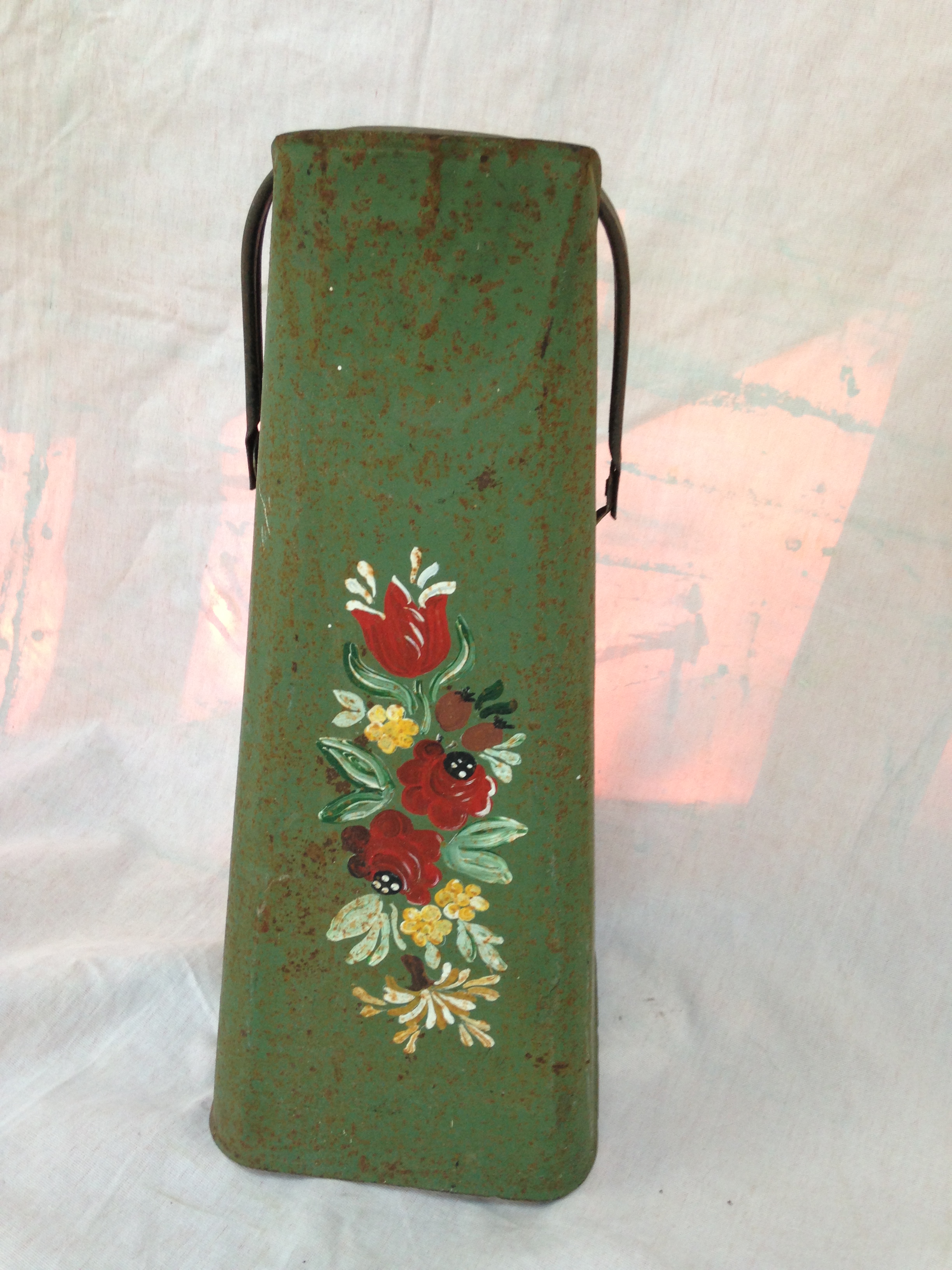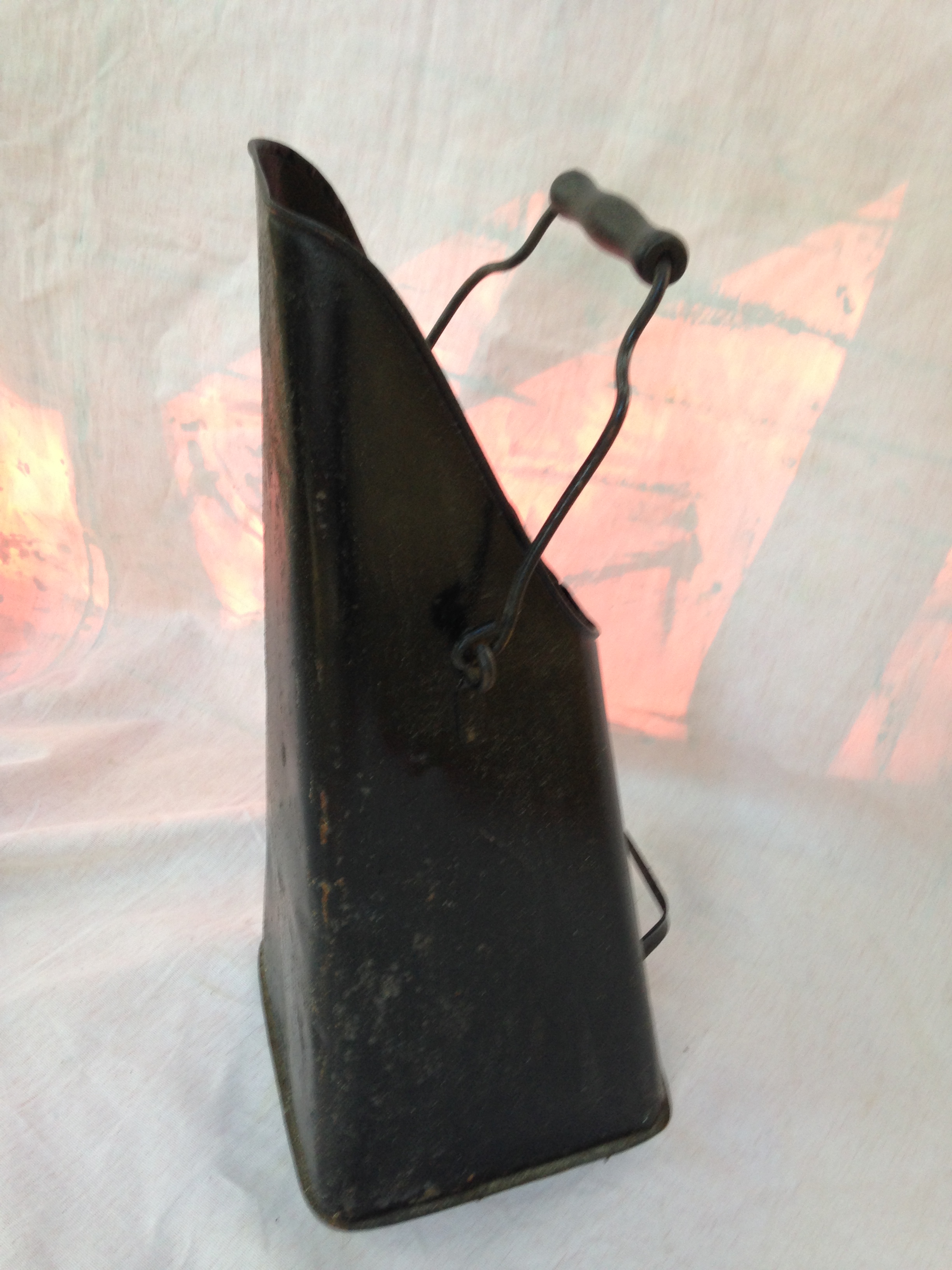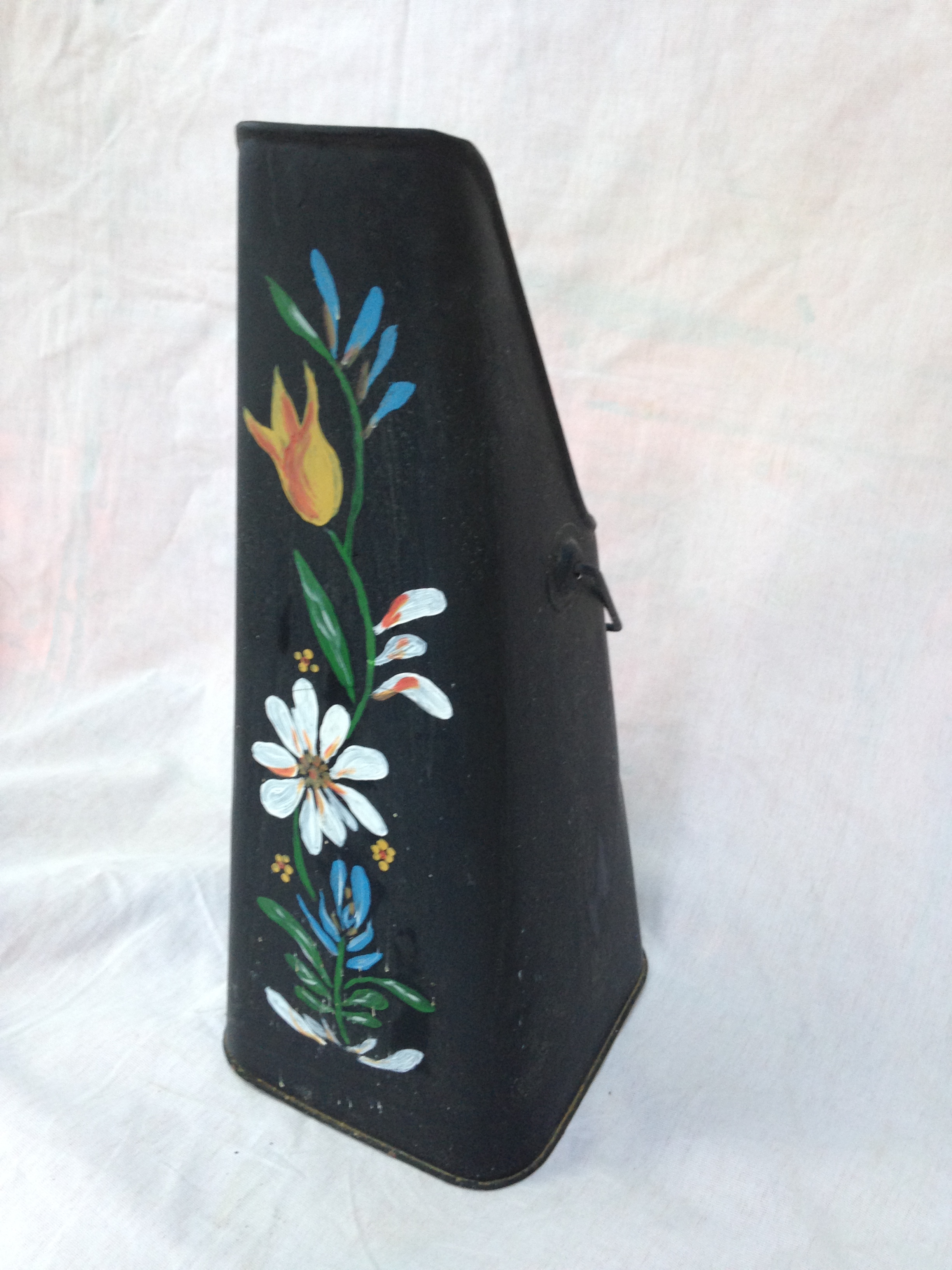 Antique tole painted coal scuttles. One is plain black with no painting. 8"w x 19"h.