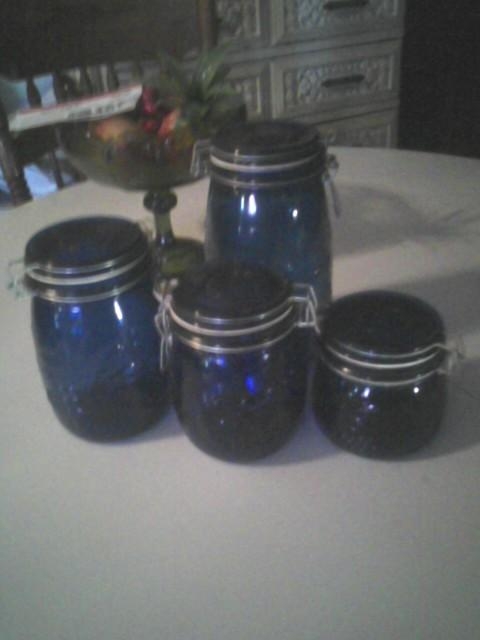 This is a nice new glass canister set, available at any kitchen shop or department store. They typically run less than $25 for the set of four at the store, and sometimes as little at $12.00. Blue glass is pretty in the window, and the seals on these jars will keep food fresh, but they are not old.