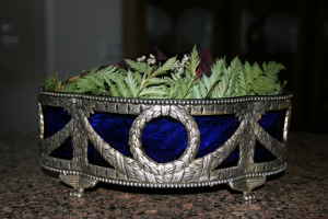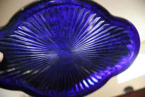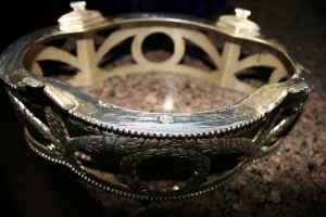 Heavy silver metal holder with cobalt blue bowl glass insert. The ornate silver holder has a hallmark on the bottom but I haven't been able to identify and the heavy bowl has a unique design with a ridged bottom. I don't know what the metal is made of?