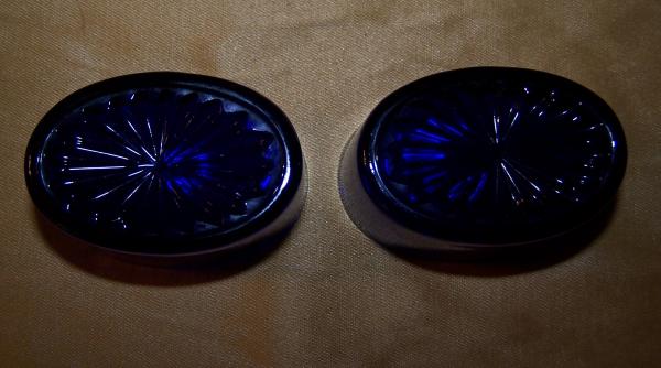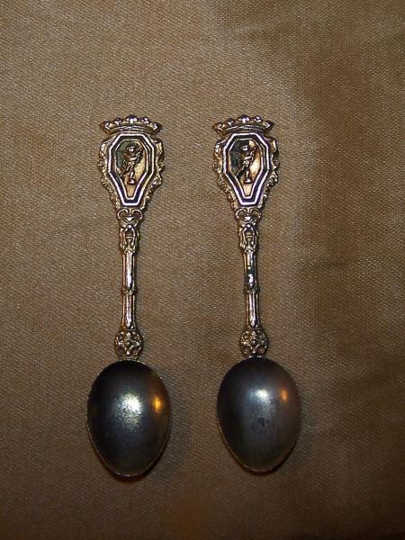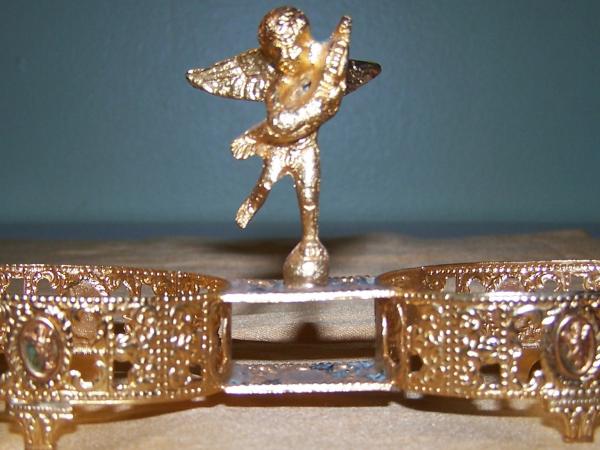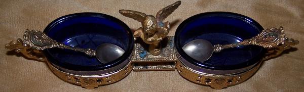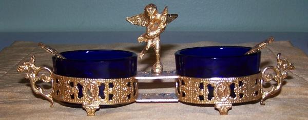Not sure exactly what this is. I thought perhaps a double jelly server. Very lovely ornate piece that has two cobalt oval shaped dishes, a gold colored carrier or basket, and two spoons also gold in color. The design has a large cherub standing in th middle, a picture of a cherub on the front of the carrier on each side. The handles are a griffins or dragons head. The spoons also have cherubs on the top of them.
