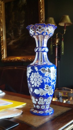 Friend has three or four pieces cobalt blue glass. I have seen Vase (photo) and creamer. Both have same design. White underneath the blue with cut out design to clear glass. Has gold design on cobalt. No names or markings that we can find. Also has two or three with similar design in a cranberry color. Was left to him by a family member. Needs to know more about to decide if wants to sell or if needs insurance on these pieces. Vase is approximately 18 inches tall. In really good condition. Creamer is approximately four inches tall and in excellent condition. I have not seen others, just photos.