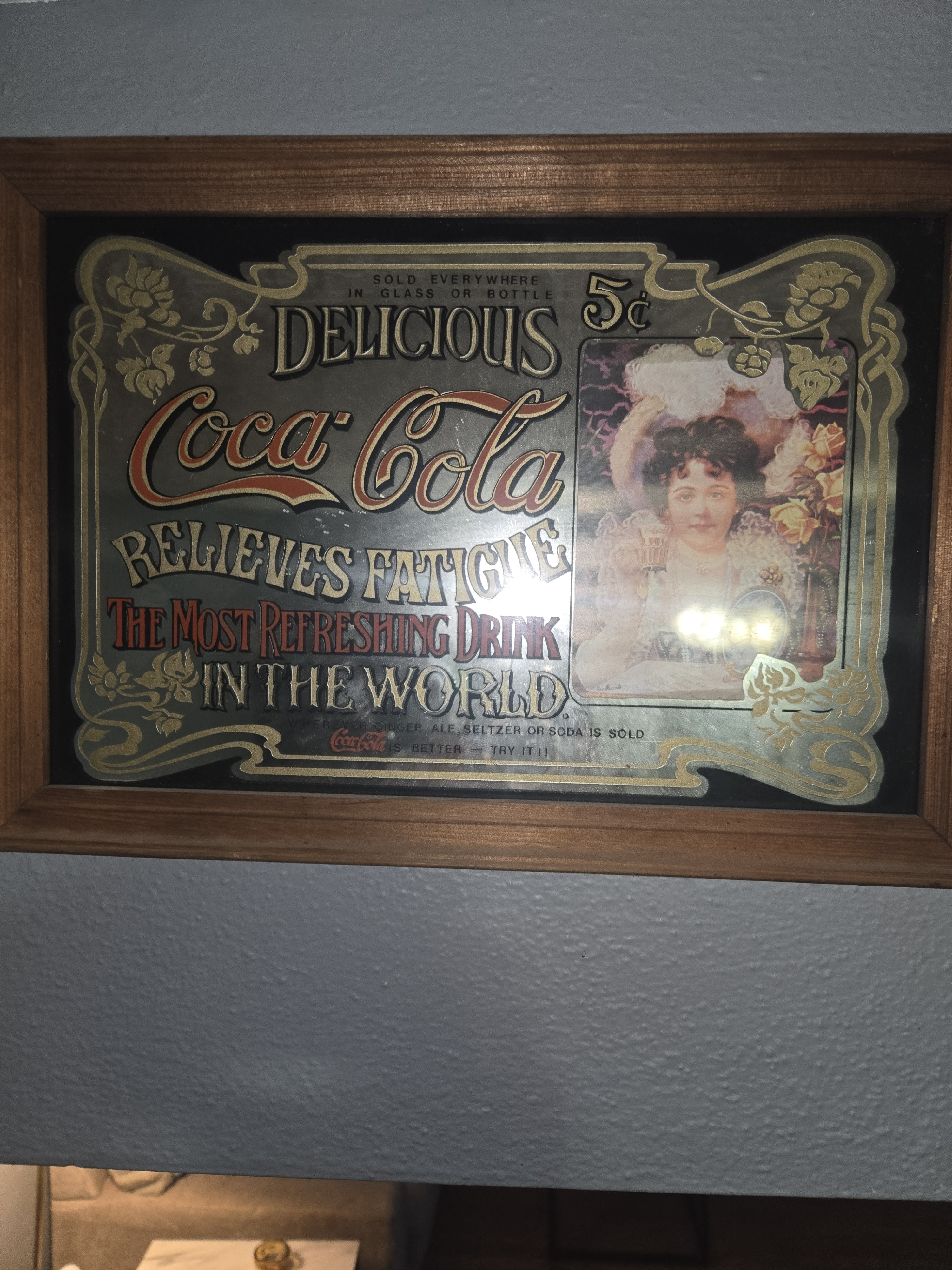 This vintage Coca-Cola advertising print features a colorful and ornate design typical of early 20th-century marketing materials. The print showcases a young woman holding a glass of Coca-Cola, surrounded by floral embellishments and the iconic Coca-Cola logo.
