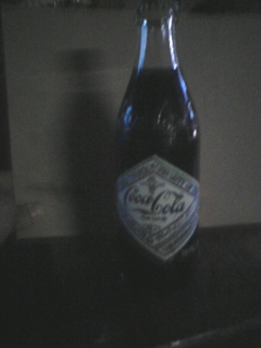Unopened cocacola bottle, painted label on front and back says, " The Atlanta Bottling Company 75th Anniversary " 10 fluid ounces