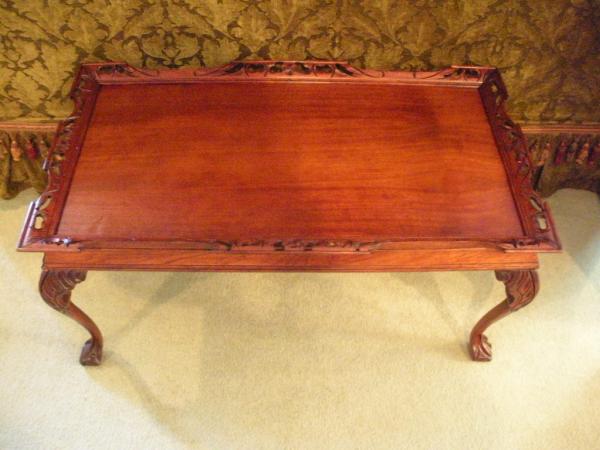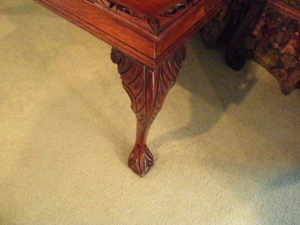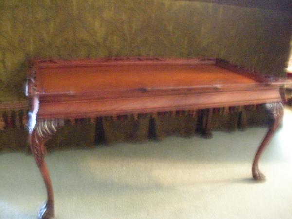COFFEE TABLE FOUND IN ATTIC ABOVE A GARAGE. ALL MAHOGANY VERY ORNATE I WAS TOLD IT IS A CHIPENDALE BUT I AM NOT EVEN SURE HOW ONE WOULD BE ABLE TO TELL.