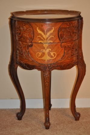 These tables have an inlaid flower design and carved legs, very petite and delicate looking but sturdy.  They have a few dings but overall are in great condition.  I know nothing about them and would appreciate any information.  There is a coffee table, 2 end tables and a two-drawer side table.  All have the same design on top as photo.