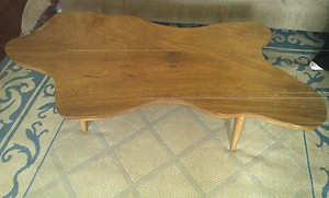 a coffee table from 1920 to 1950 from malaysia made of teak wood a trademark on bottom a leAF with ICP INSIDE THE LEAF seems to be one of a kind