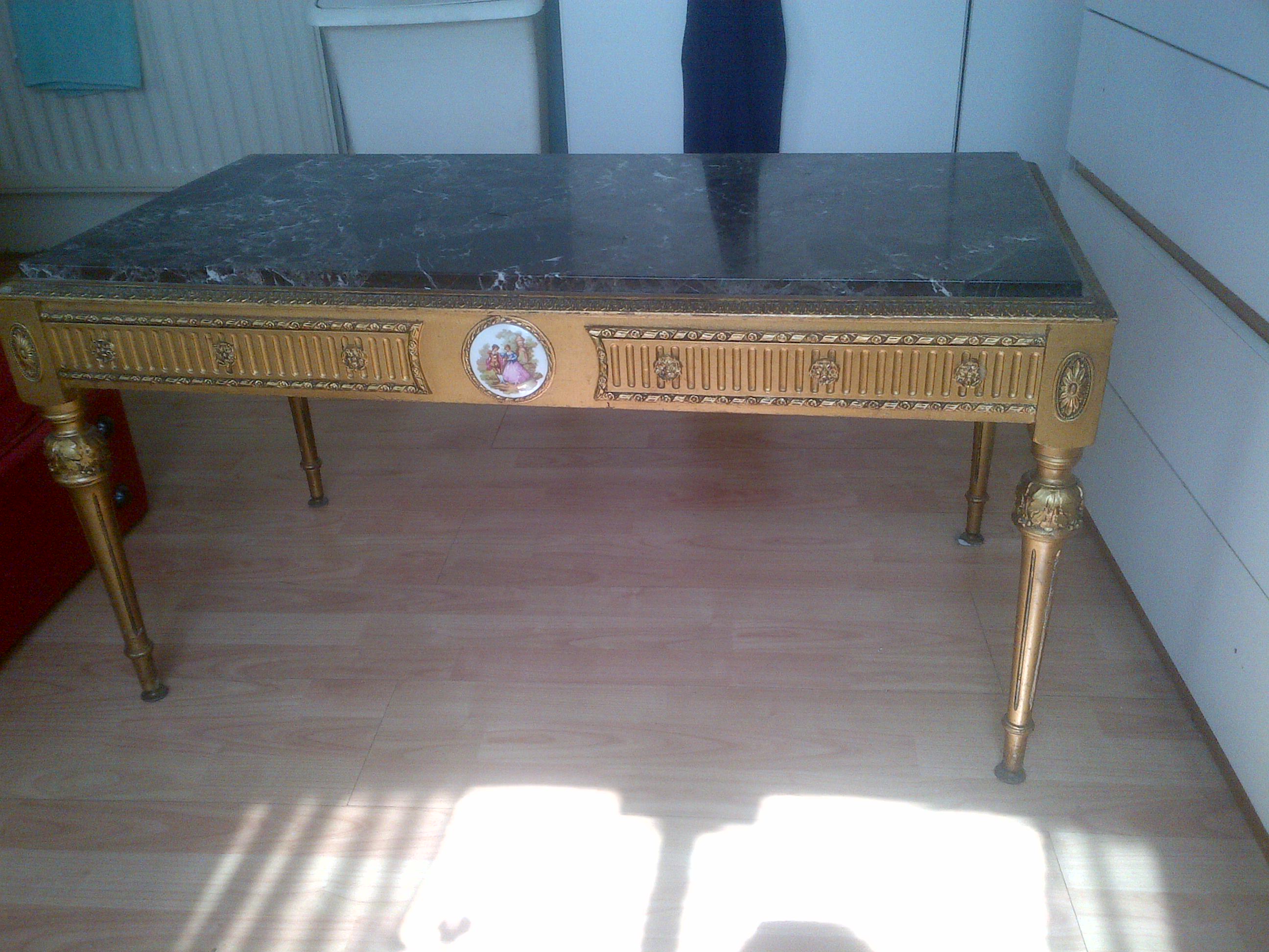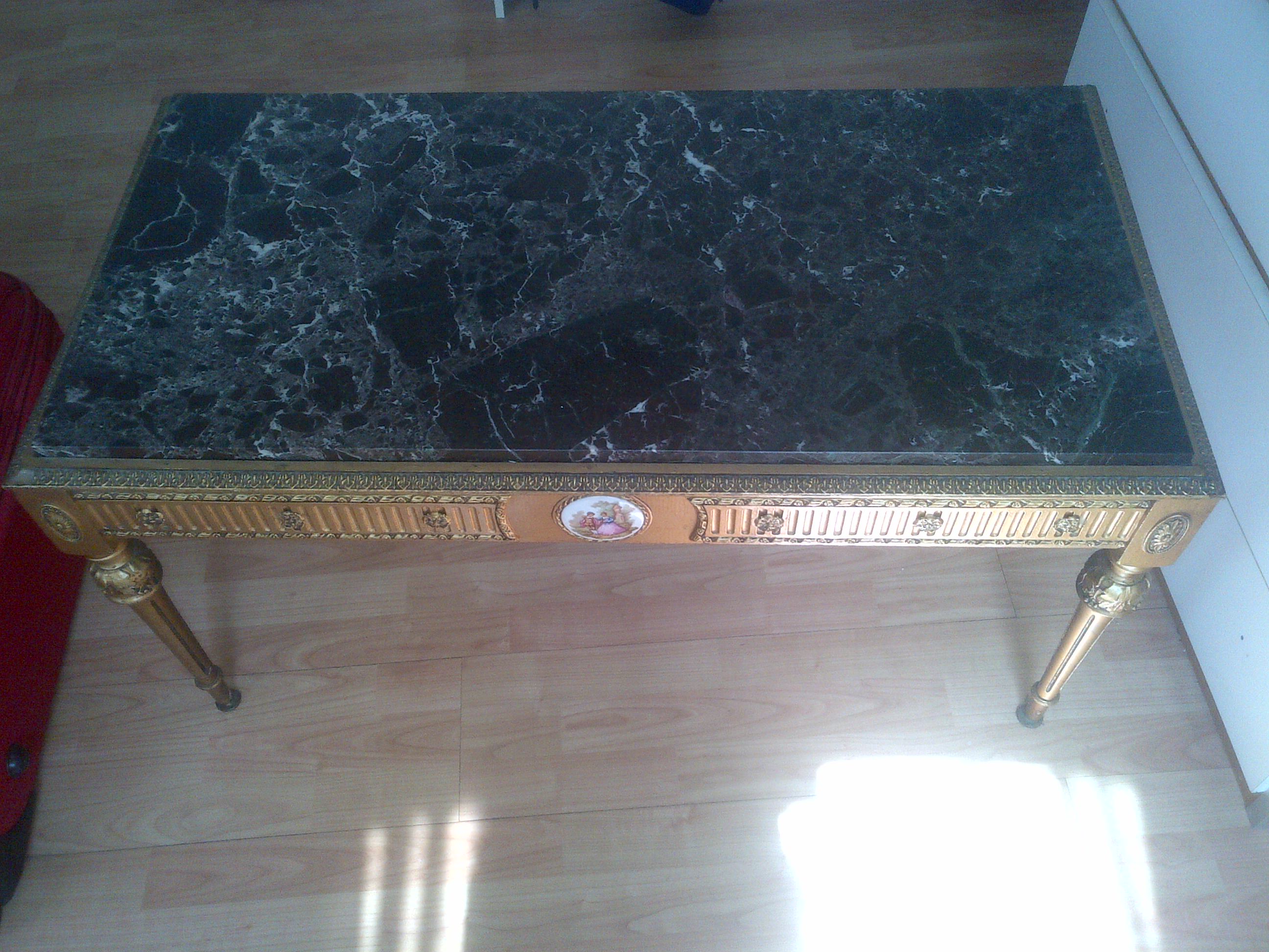 I believe this coffee table is around Fifty plus years old, although not antique very different from what I have seen for sale, its Onyx and Marble with Gilt legs and Cameo pictures, it was given to me by my Grandmother and the story behind it suggests that only a few where ever made,it is in very good condition and has really never been used except for display, I really dont know much more about this piece.