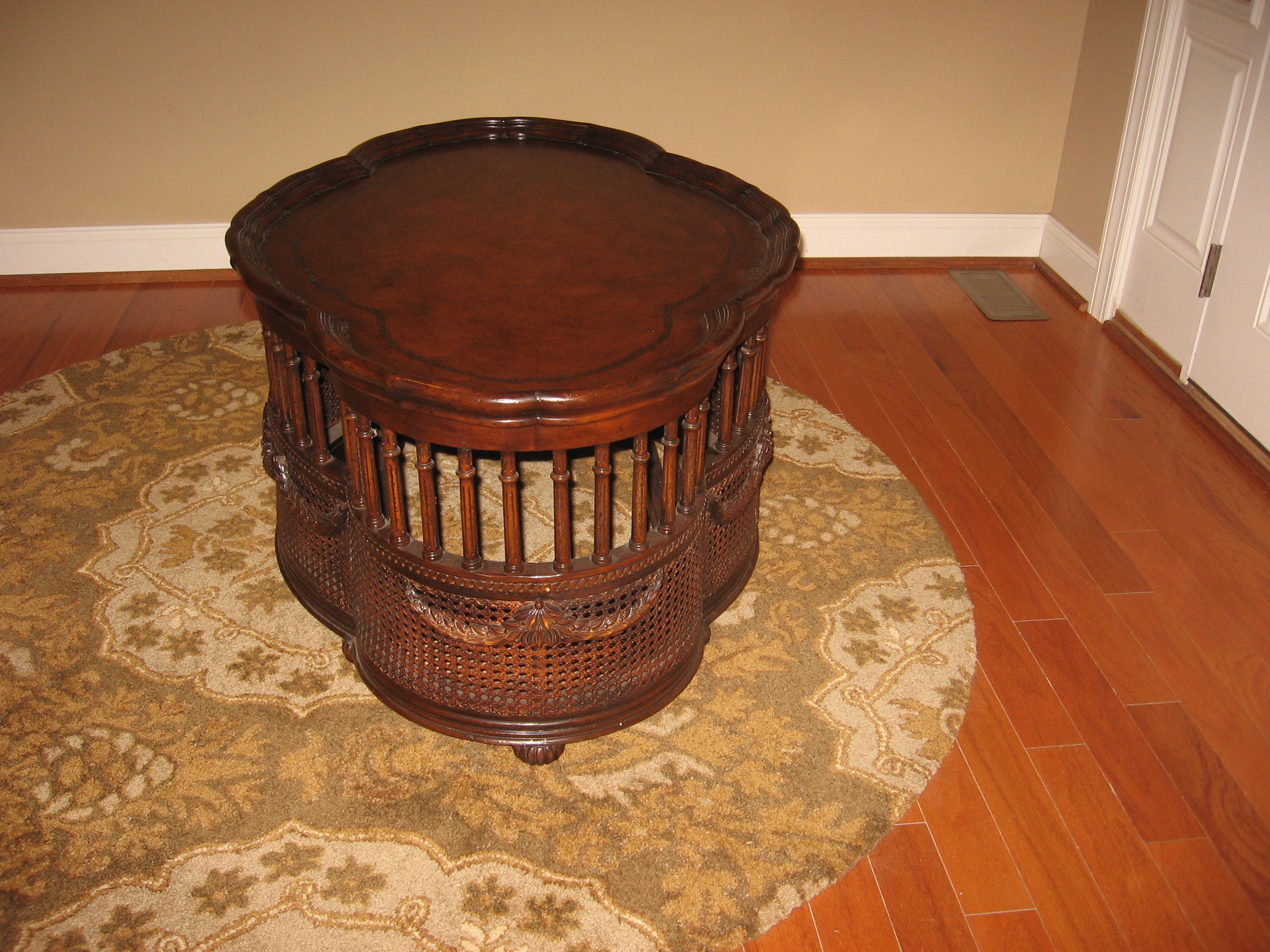 Cherry coffee table with scalloped top, spindle detailed mid section, scalloped swag like leaf trim and caning base.
