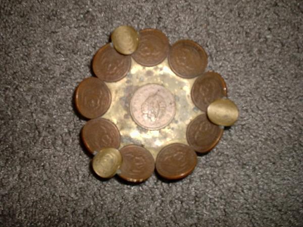 item looks like mexican coins or back has coins all around it that says centavos 1965, 1970,1967...each coin has different year in the front at the bottom of the coin dish has a coin 1958 that reads cincuenta 1958...thats pretty much all i know about this