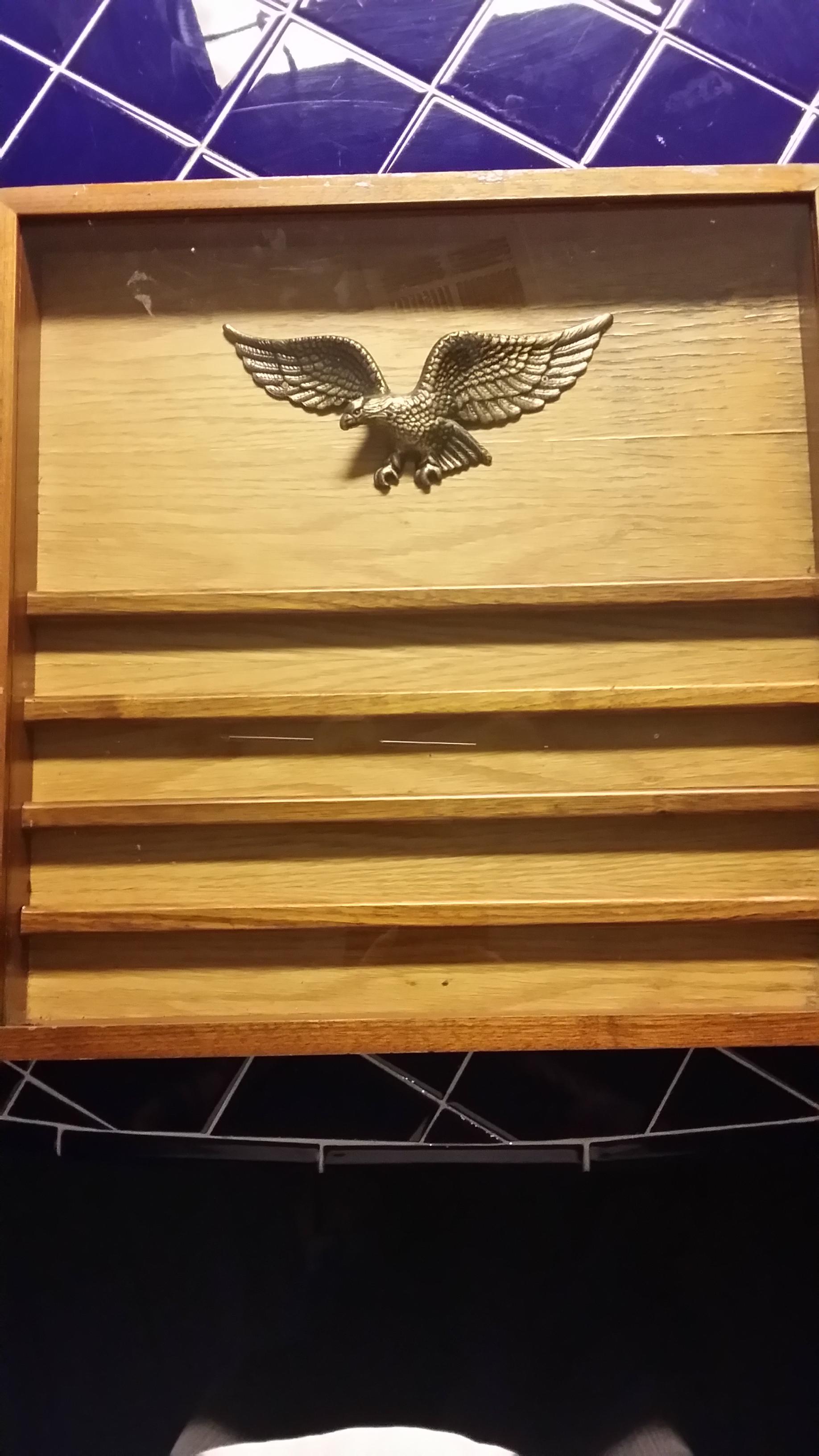 20"×20" wooden shadow box with five shelves that possibly hold coins due to the thin rail in each shelf. Glass in front slides out through the top of the box. Has a copper or gold colored eagle in the top of the case.