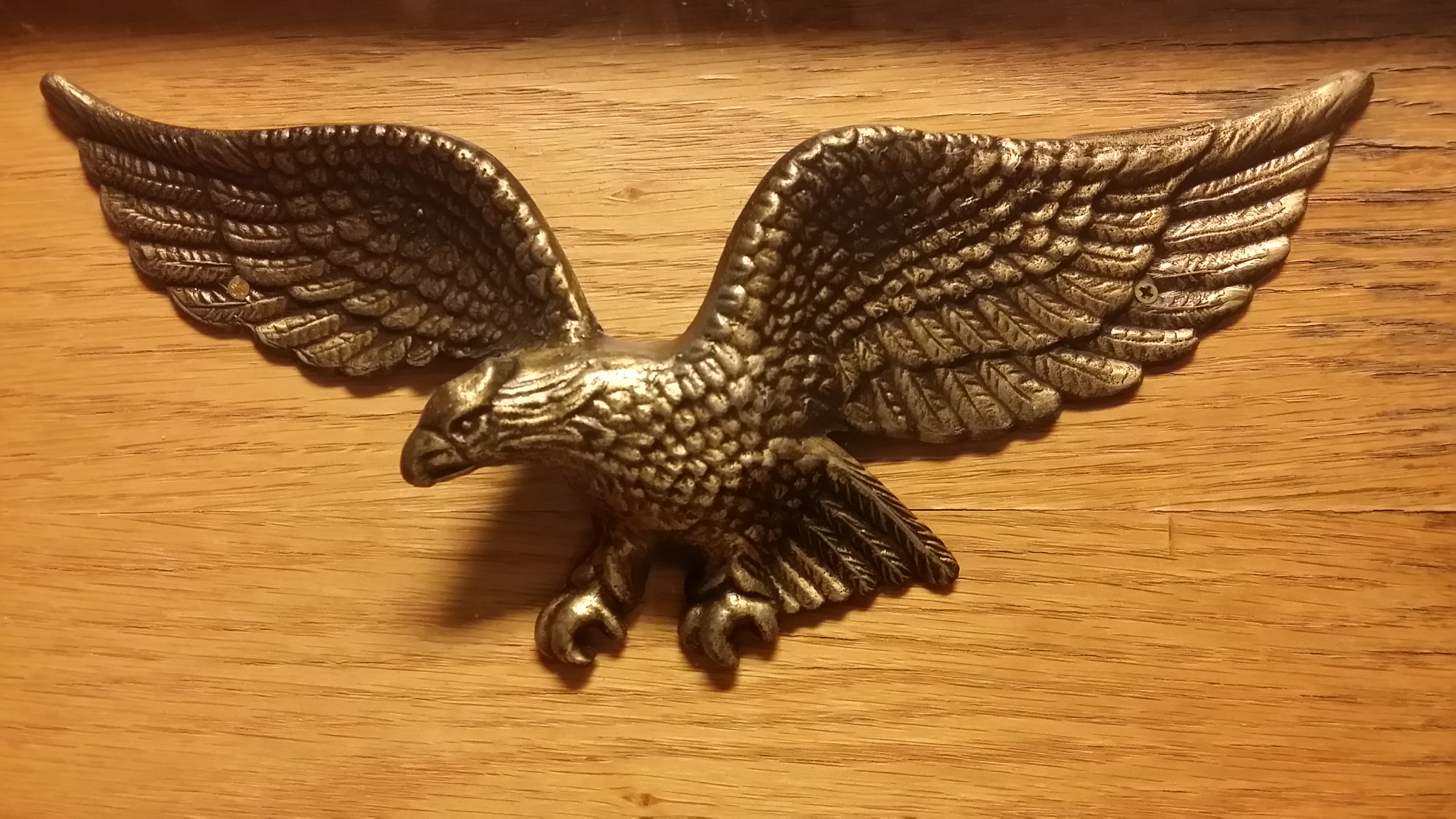 Medium Wood box with glass in front. Brass or gold colored eagle inside.