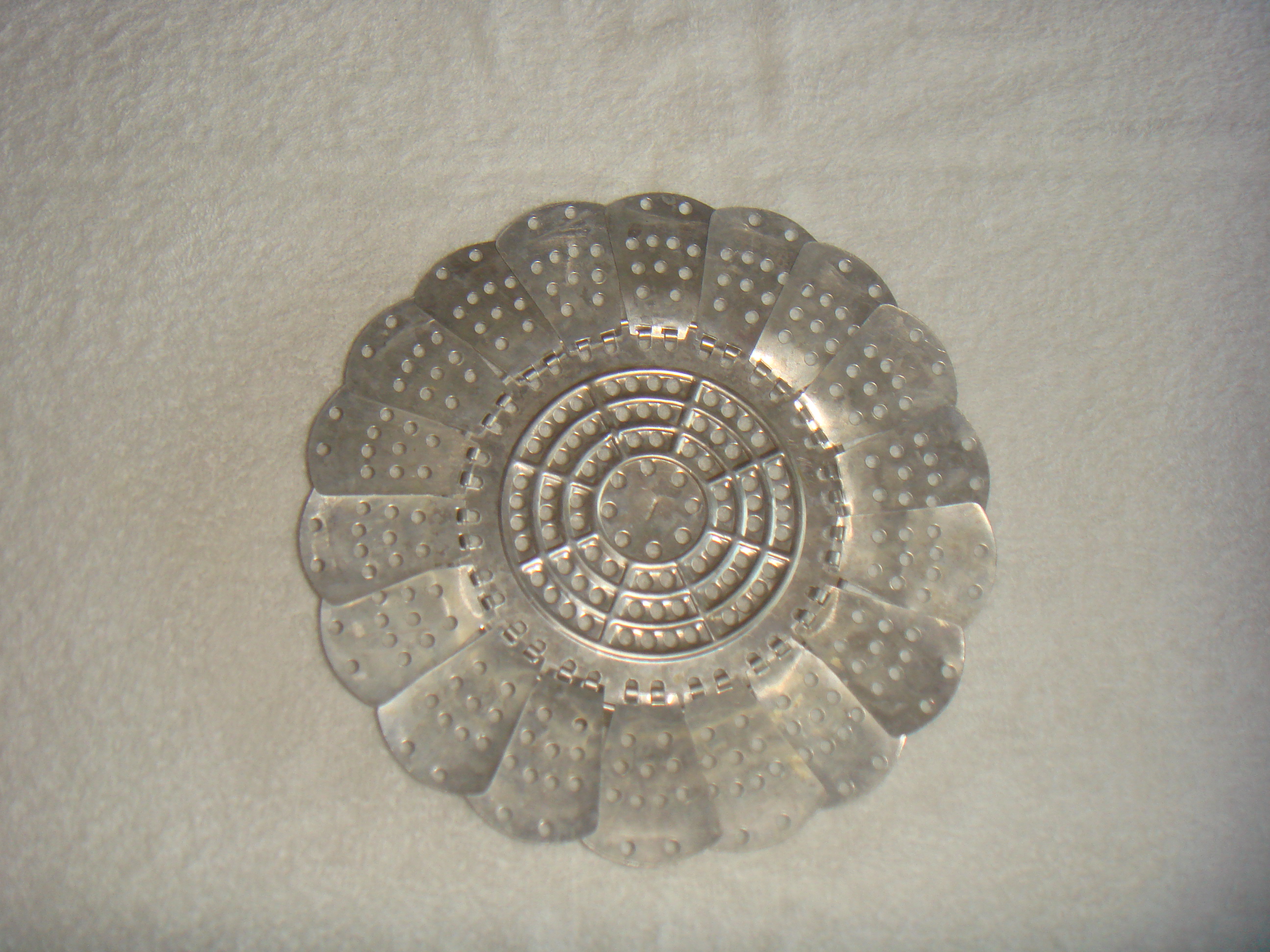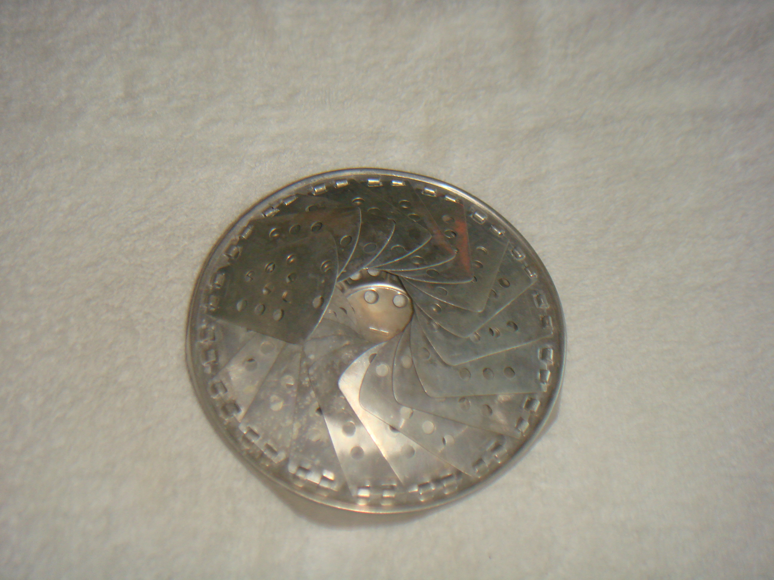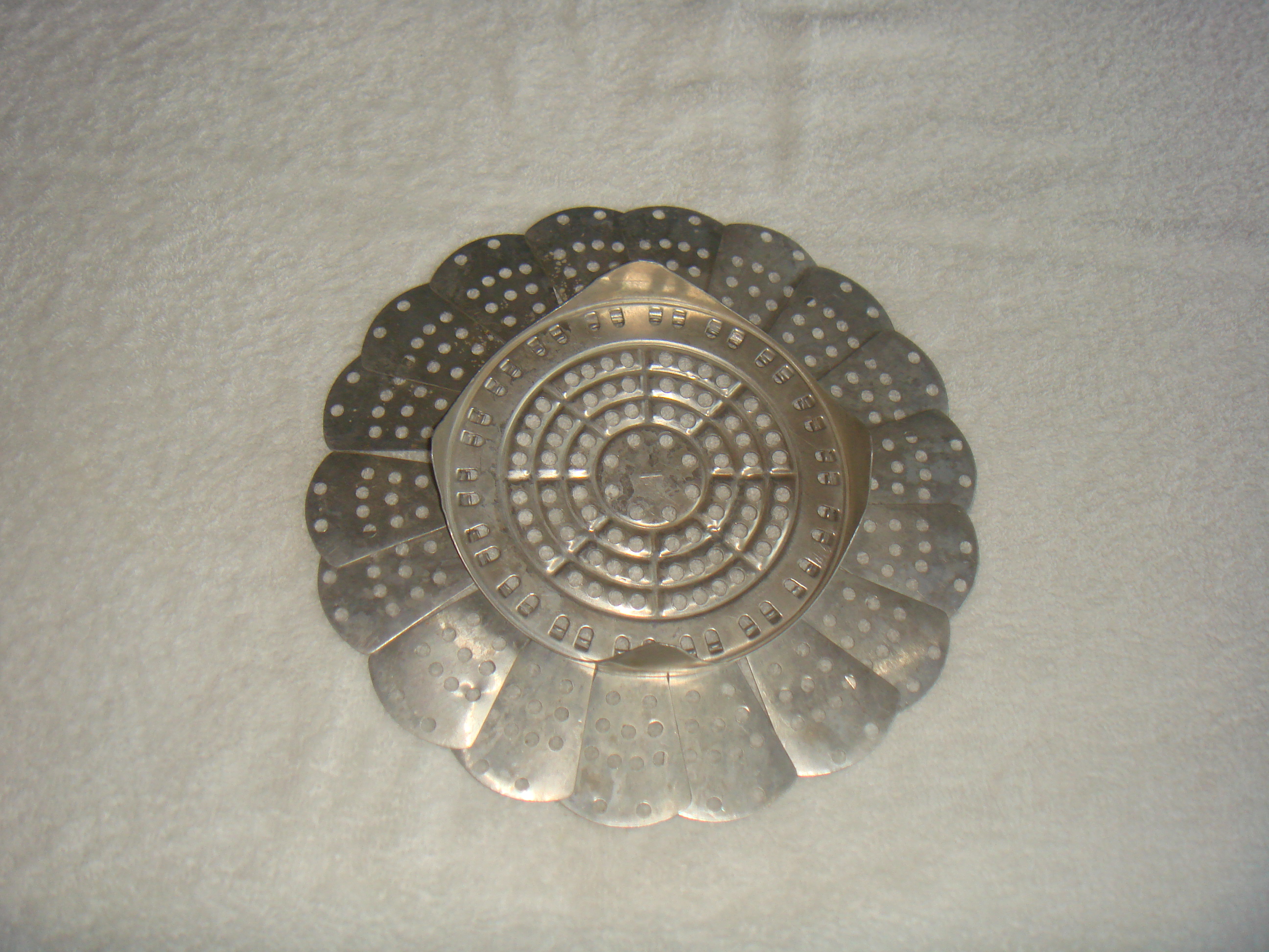 i found this unusual trivet in a box i got at an auction. best i can tell its aluminum the "petals" are hinged and fold in. its really cool but i cant find any info on it. i cant find anything even similar to it. it appears to be old. i would love any info anyone could give me. about how old is it, whats the value, what is it called..... any info at all would be awesome. i guess its in fair condition since i dont know how old it is or what it looked like new