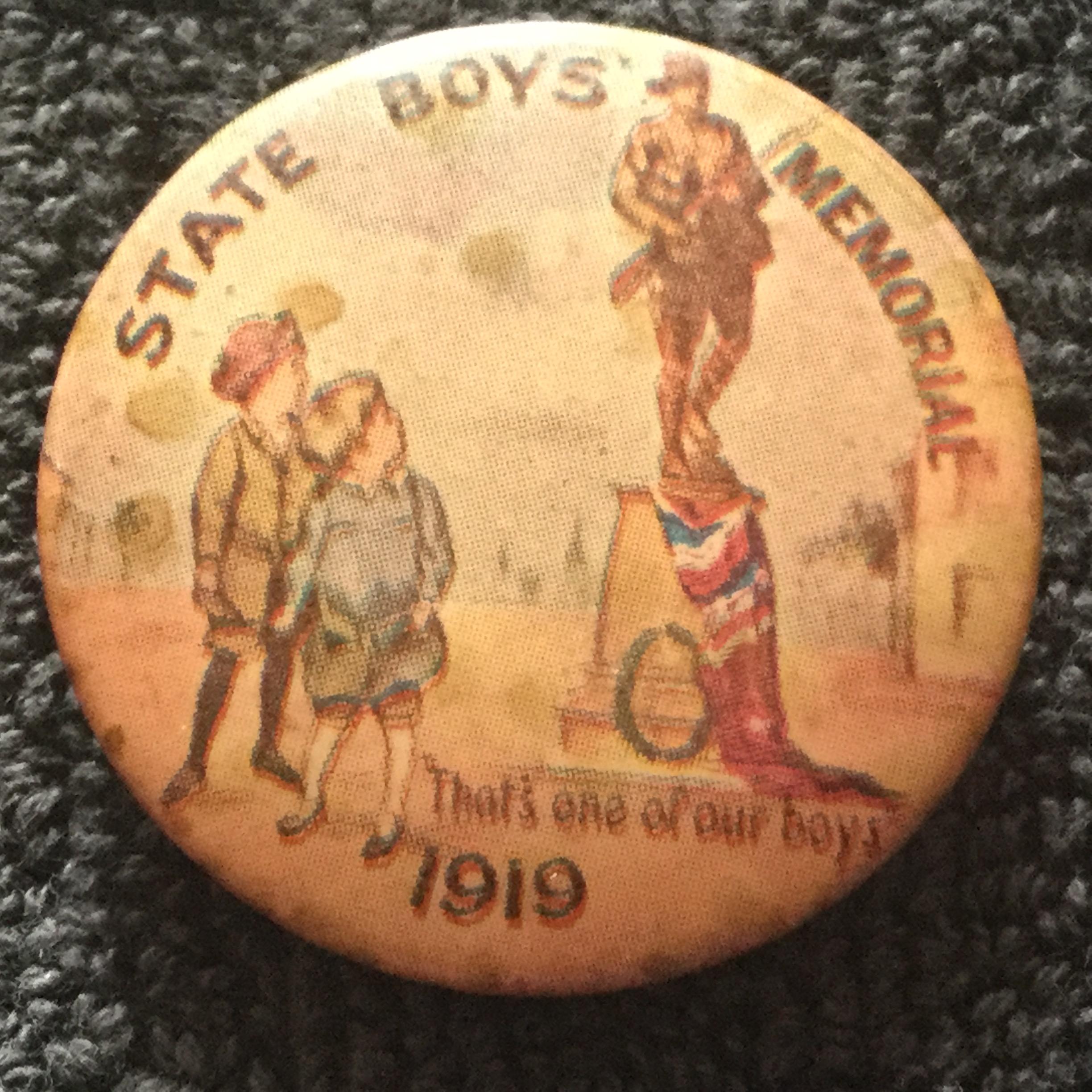 WW1 State Boys Memorial plastic coated pressed tinplate metal badge with a celluloid face and a pin attachment on the reverse.