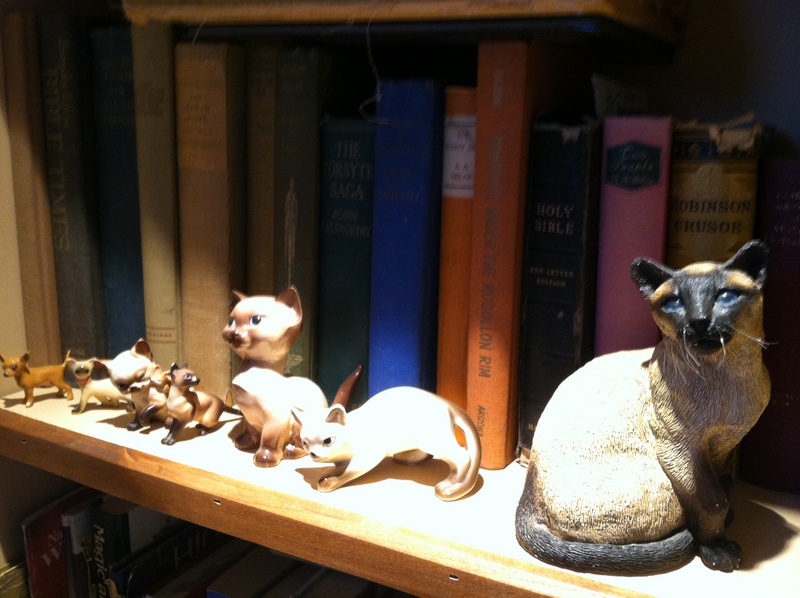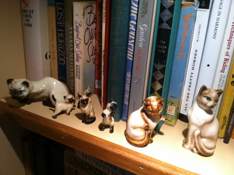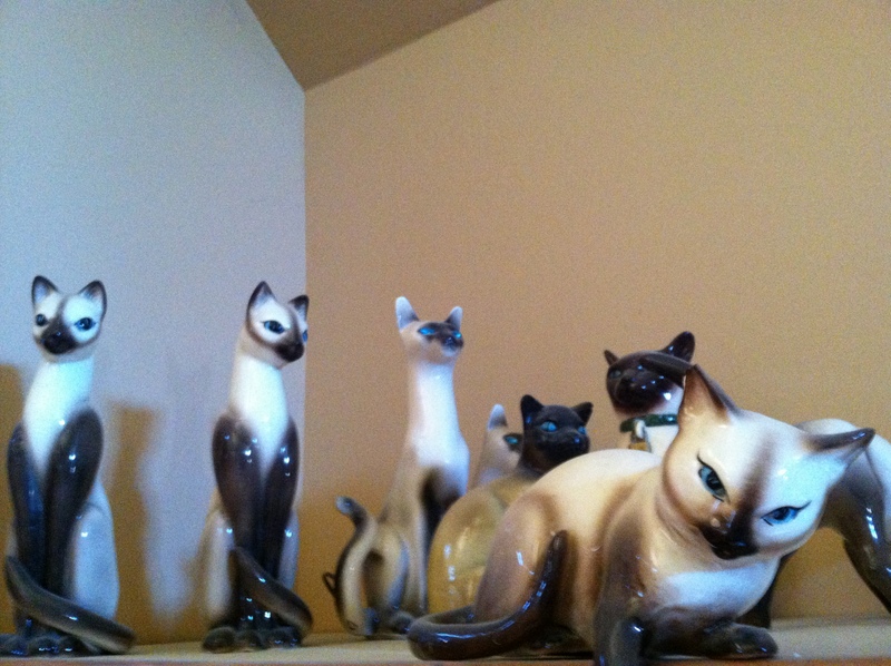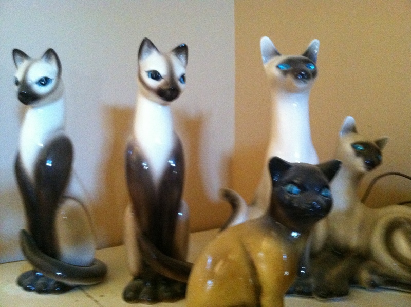 Collector was born in 1913, cats in good condition. Mostly ceramic. Some stamped, some numbered 149 & 359. Unsure of some markings, could be h/r, hss & japan. 1 "Thai" by Ceramic Arts studio in Madison, WI. 1 by Brad Kemmea, #770. 1 Maston w/padlock. Salt & pepper shakers. 1 Cat light. Whiskers by Martha Carey