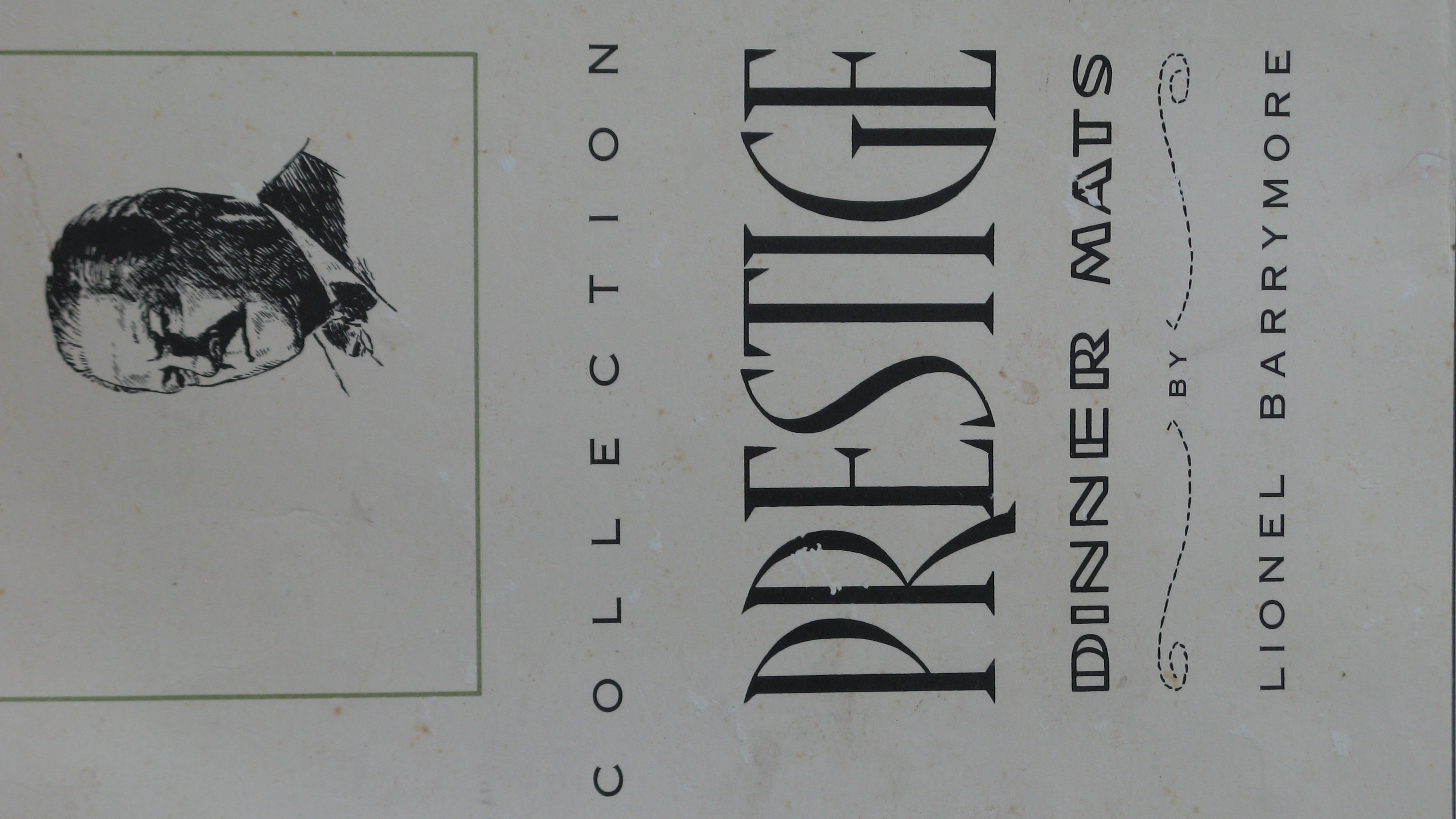 This is a collection of pen and ink prints (4) created and individually signed by Lionel Barrymore. They were marketed as a set of placemats and laminated in plastic. The cover of the product reads "A Collection of PRESTIGE Dinner Mats by Lionel Barrymore." There is also a printed likeness of the artist-actor on the cover. The prints are entitled "San Pedro," "Quiet Waters," Point Mugu," and " " Purdy's Basin" ". I was able to upload a photo of the cover with the title and the artist's likeness, but not the individual prints. The cover is in fair to good condition. The prints are in excellent condition.