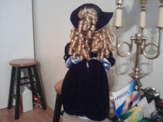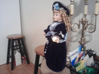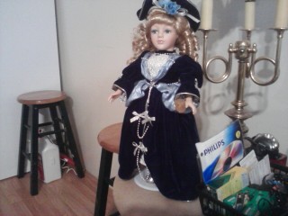 It is a beautiful about 16 inch porcelain doll. Blonde hair with blue eyes. Wearing a dark blue dress with light blue lining. Silver chains and bows down the front of the dress. She also has a Blue hat with roses and a silver bow. It says limited edition and she has a stand with it.