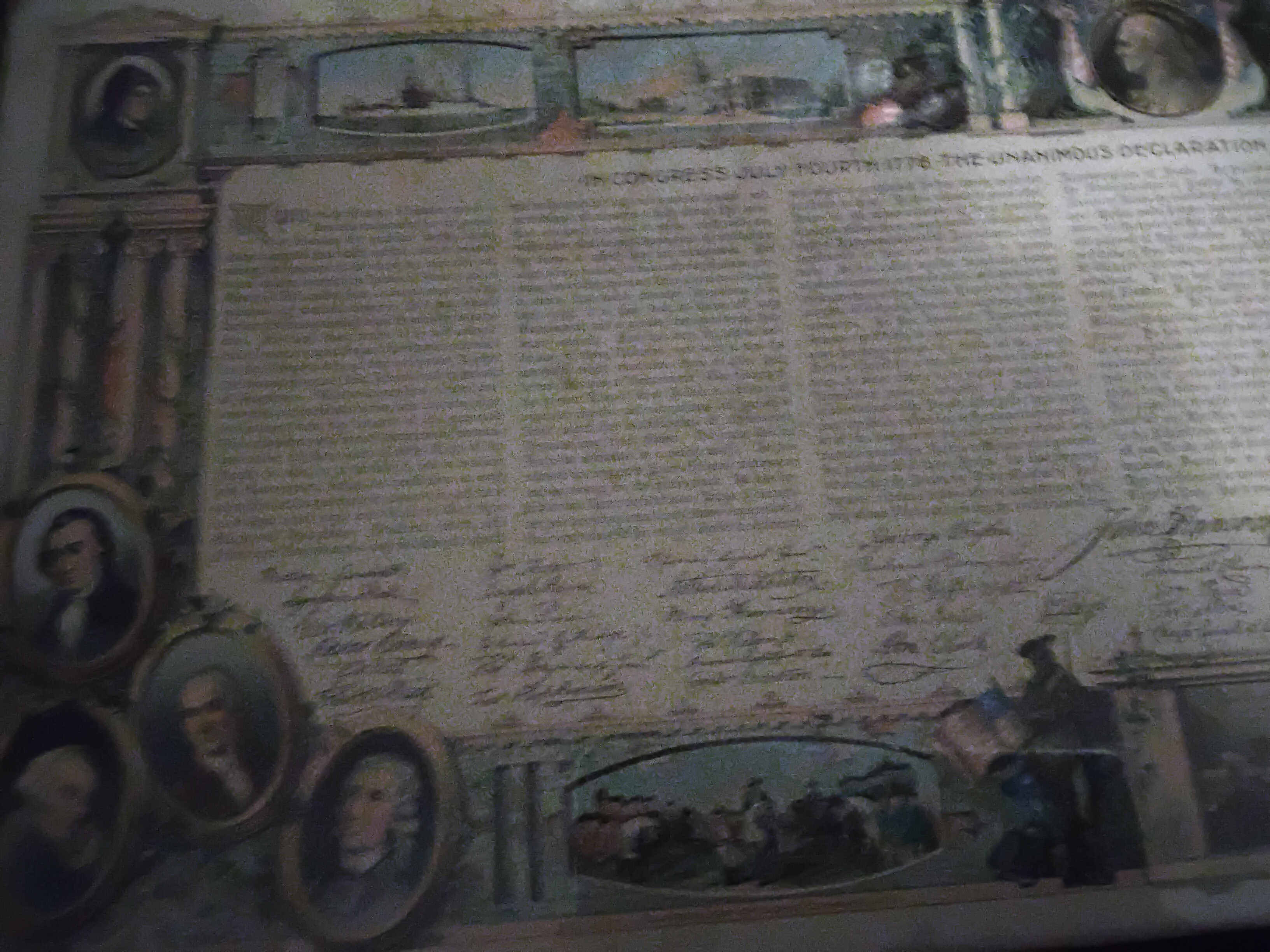 Physical Description: This colored broadside features the text of the Declaration of the Thirteen United States of America, dated July 4, 1776. The broadside measures approximately 26 inches by 11 inches and is framed. The document is adorned with vibrant illustrations, including portraits of key figures and scenes from the era. The colors remain bright, although there is some foxing present, indicating age-related discoloration.
