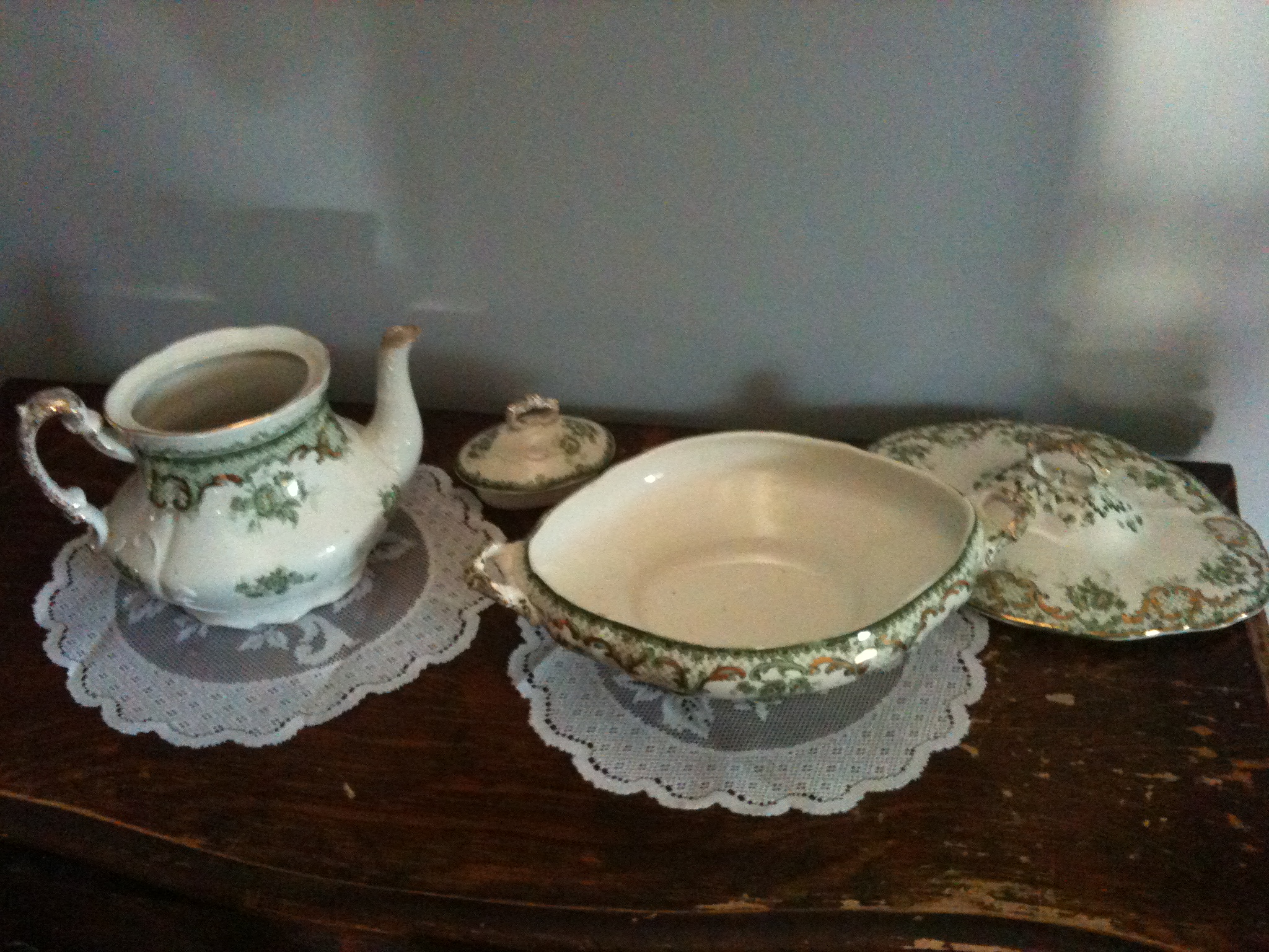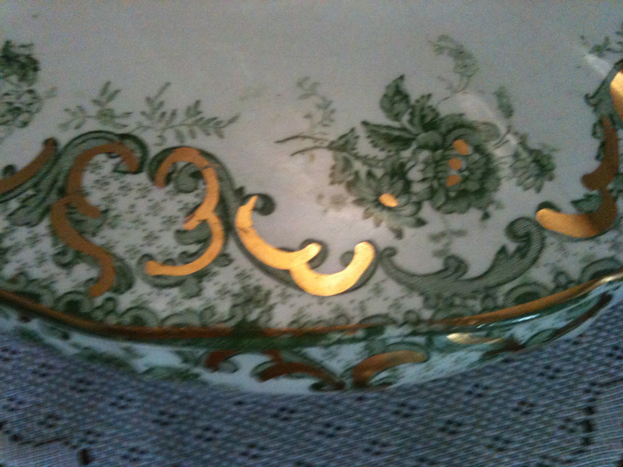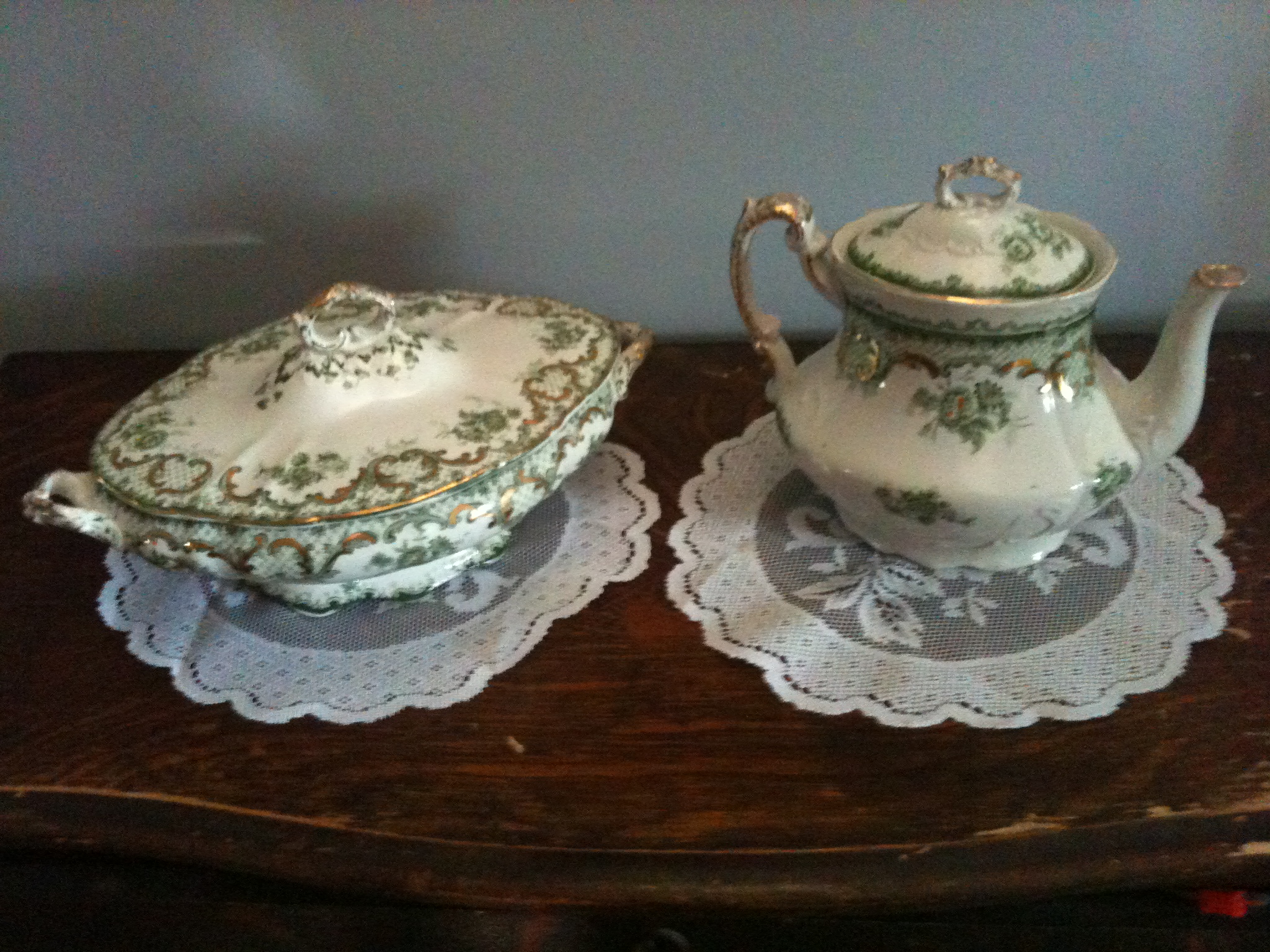 The set is green and gold. The green looks to be printed under the glaze and the gold is on top of the glaze. It is in excellent shape, no chips, but it looks like it was used b/c the gold is worn off of the handles of the teapot and lid.