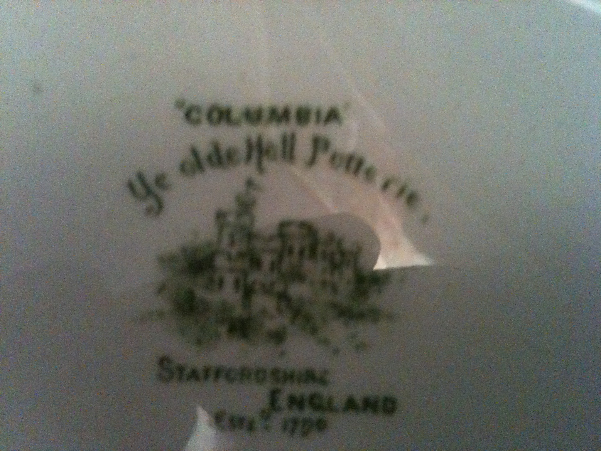 The stamp on the bottom says "Columbia" Ye Olde Hall Potterie Staffordshire, England. I have posted a pic of the stamp, but the date is not very clear, it says: Este 1790.
