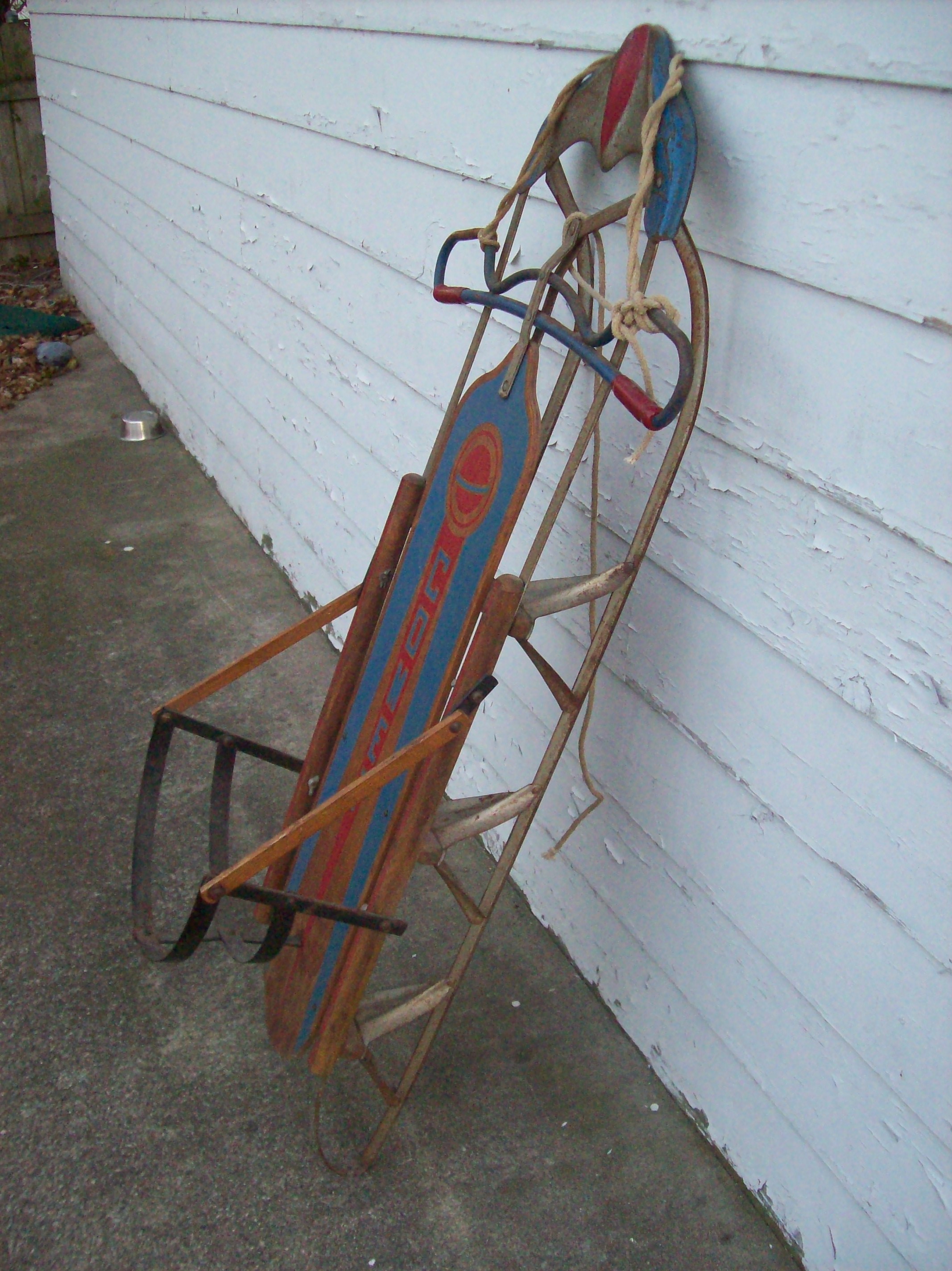 This sled is in excellent shape and the paint is completely intact. My grandfather relayed many memories of the races between his friends down the hills of Racine here in Wisconsin during the long winters. He showed me how it was designed to steer with your feet when sitting up or with the rope tied to it correctly you can utilize it to steer also. Lying down steering is easy. He said it was about the fastest, easiest to steer and most coveted sled around at the time. It is a gem.