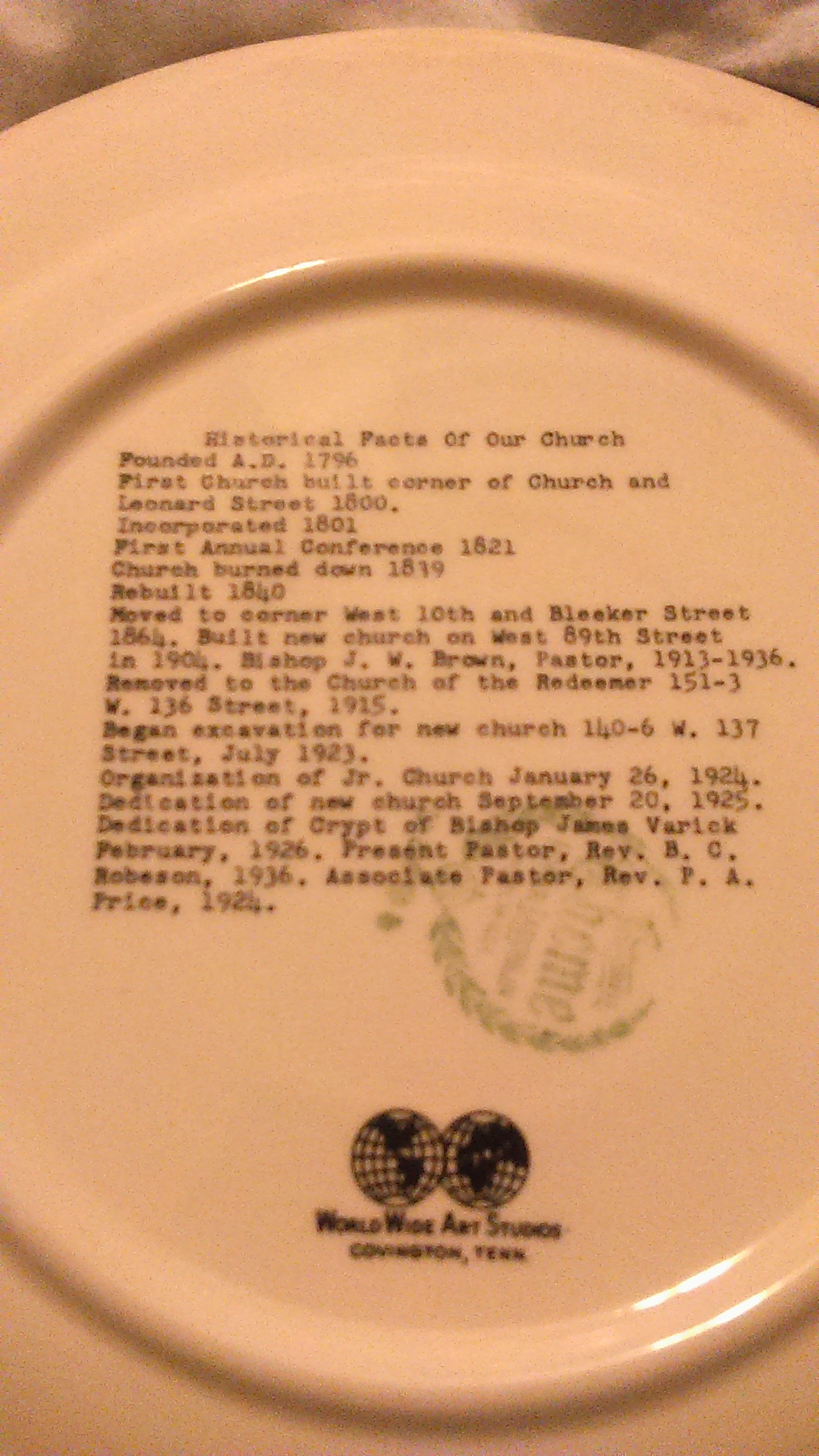 Commemorative plate of The historical church A.M.E. ZION New York, New York. The church was founded in 1796. The plate is by Homer Laughlin. World Wide art studio did the engraving. I can't see the code on the back, so im not sure if it's an antique or not. Can anyone give me any feedback on this piece.
