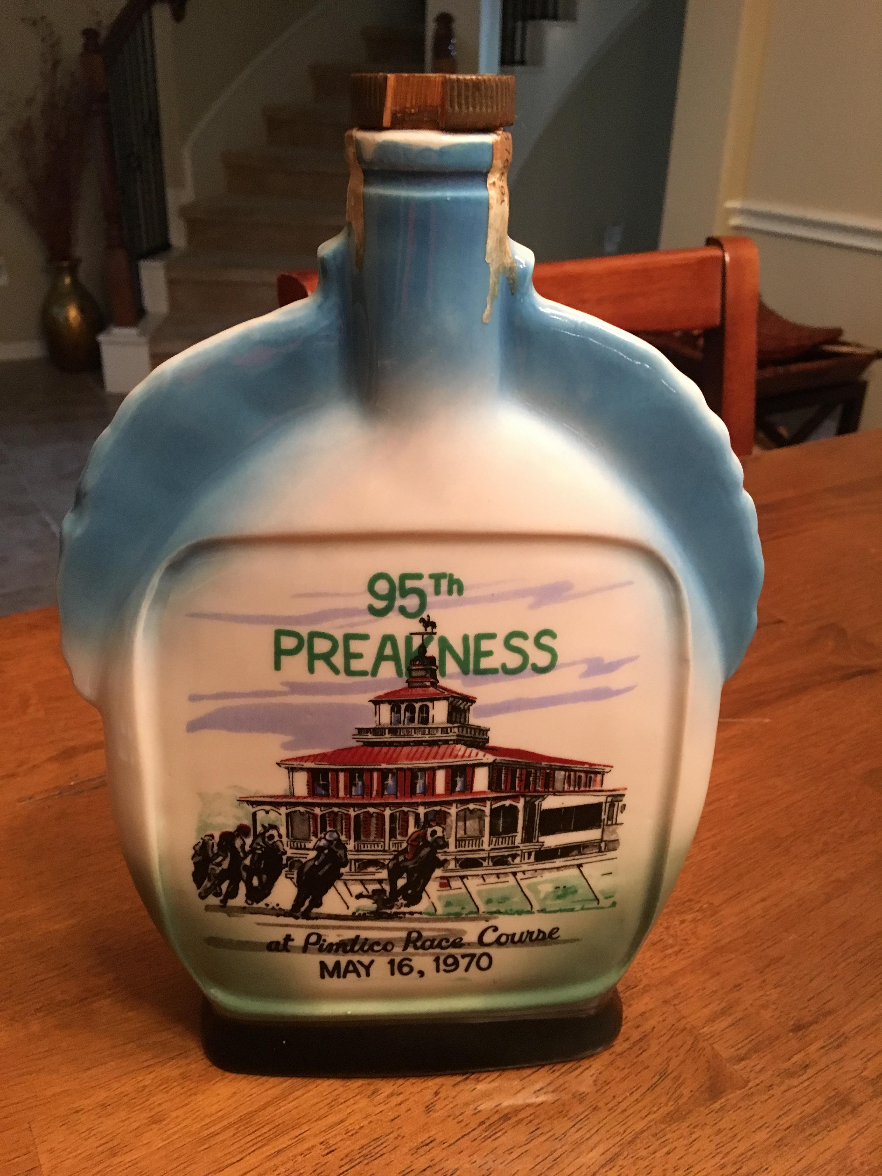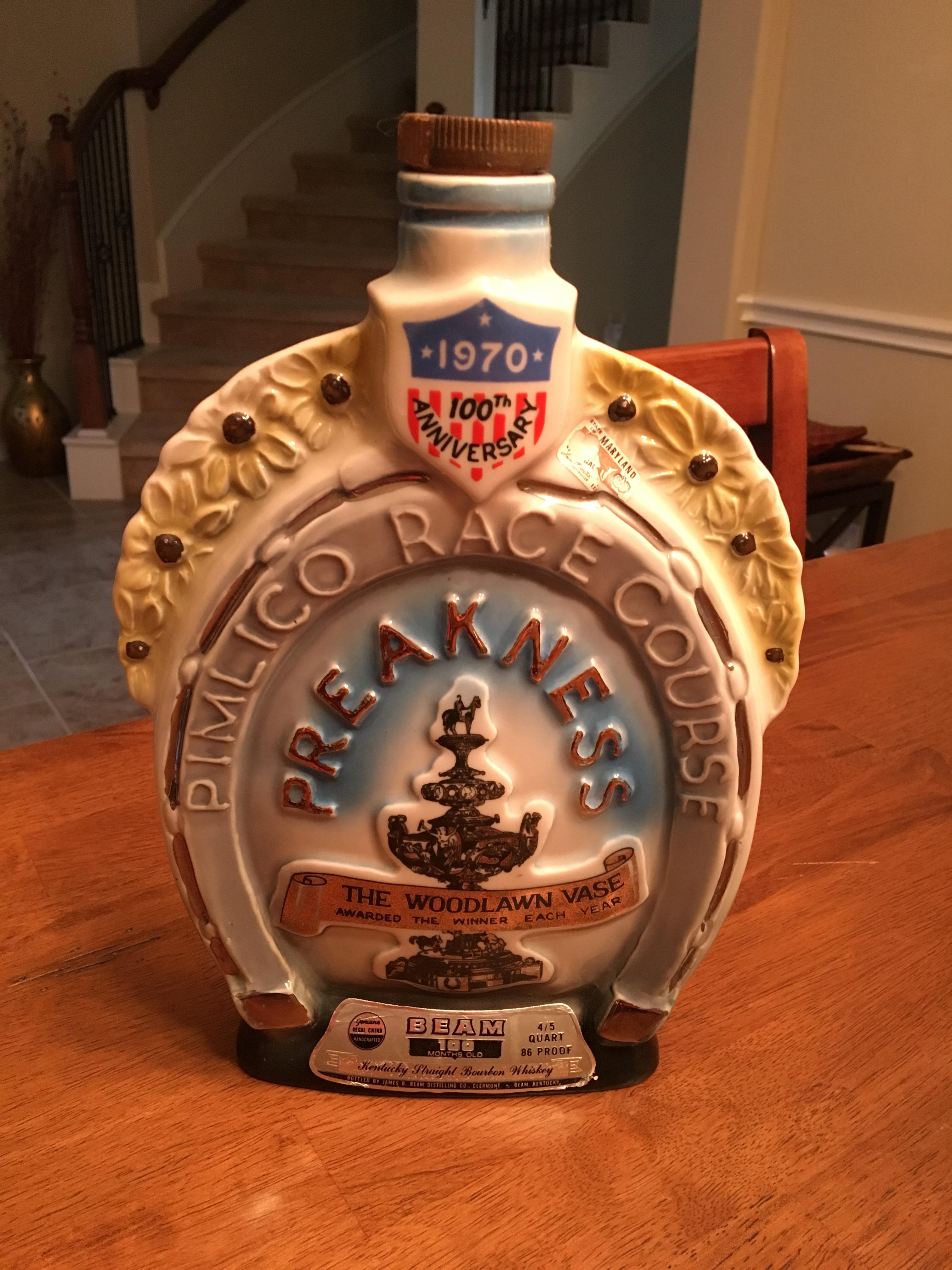 Commemorative Jim Beam Kentucky Bourbon Whiskey Bottle in honor of the 95th running of the Triple Crown Preakness. Horseshoe shape.