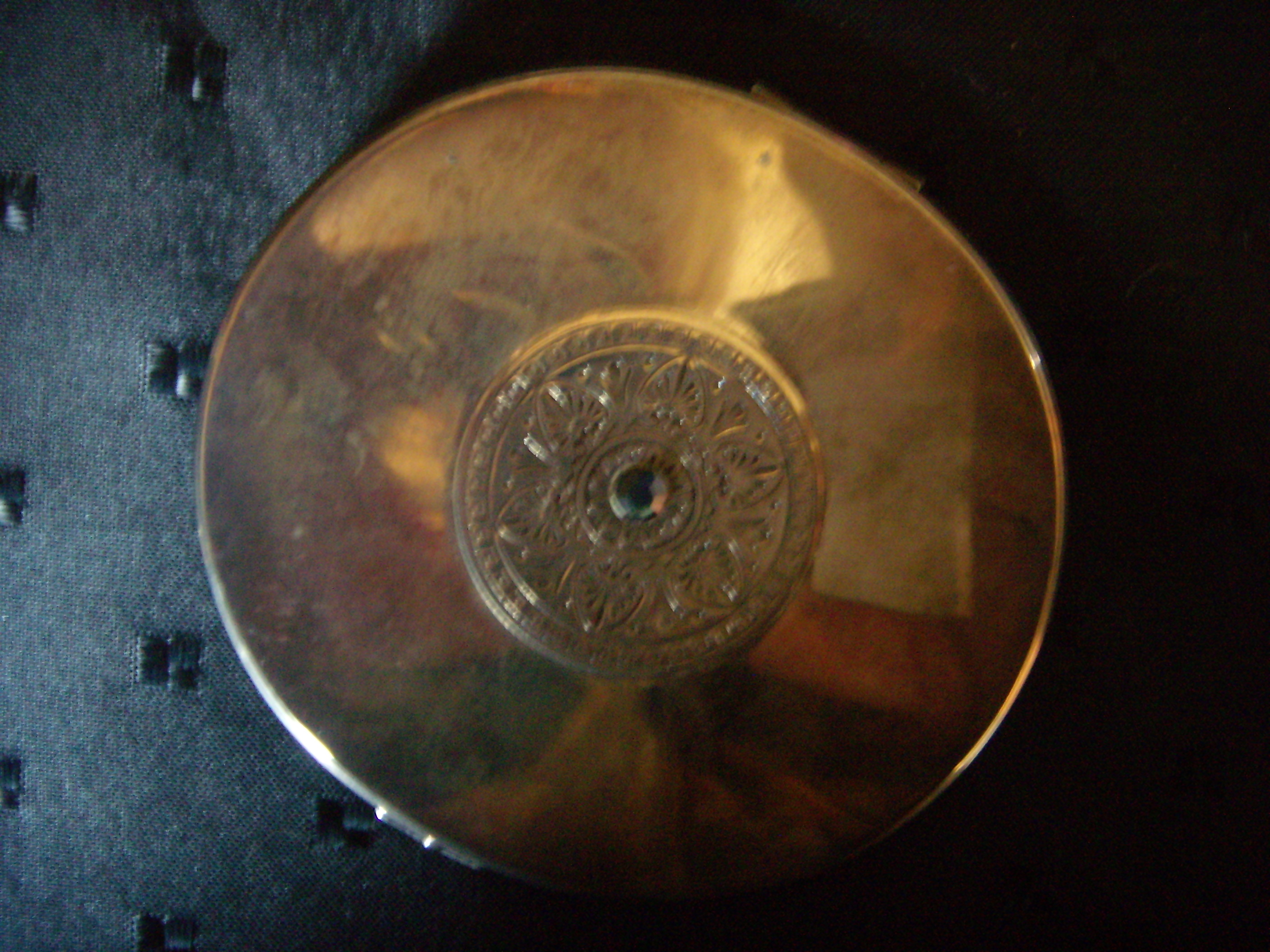 This is a sterling silver compact...I would say art nouveau...a blue gem stone with embossing on the front...in a flower pattern and circle surrounding...it is signed on the back in fairly large writing...Doulton...inside are two mirrors...it is in perfect condition...