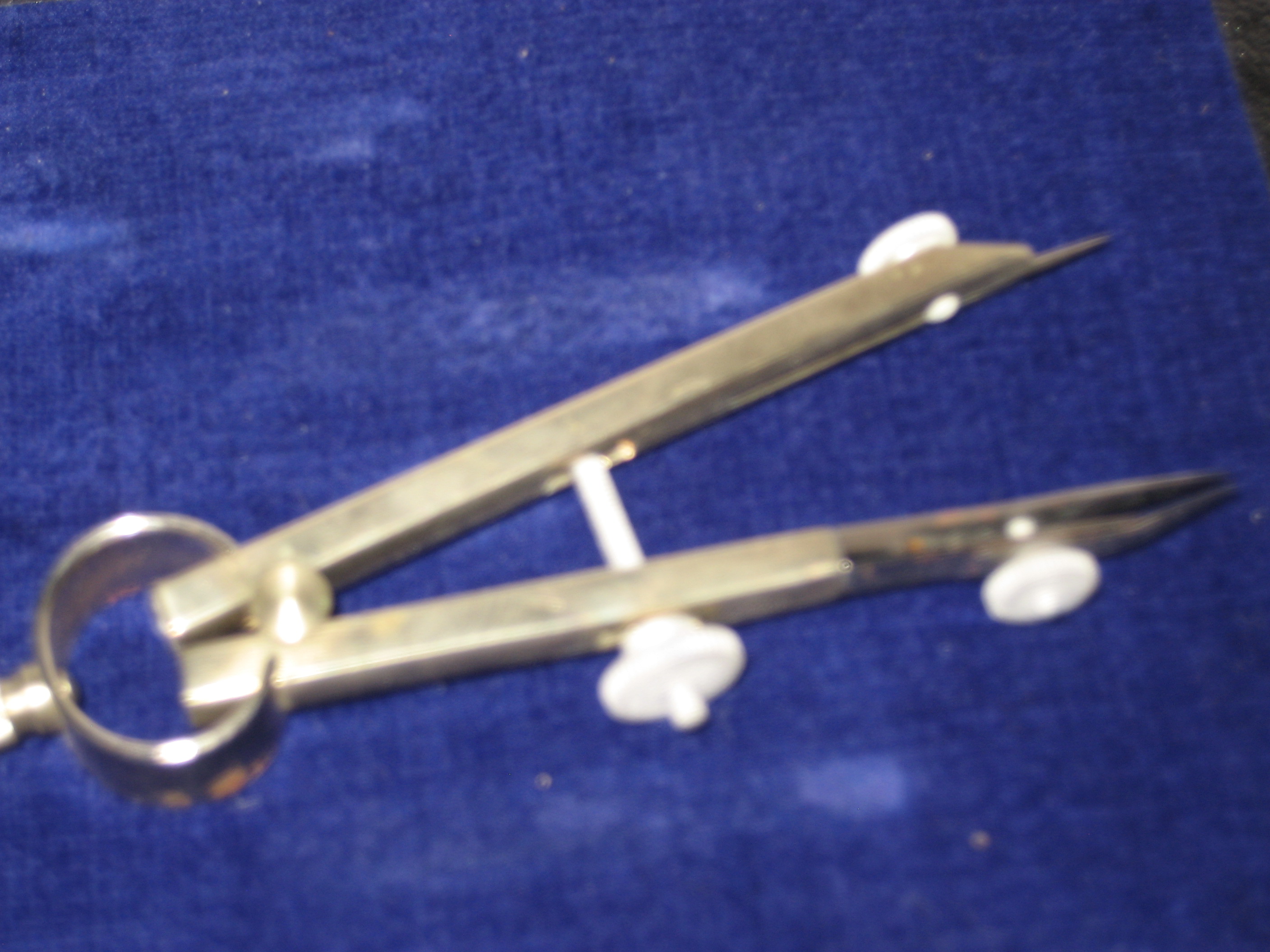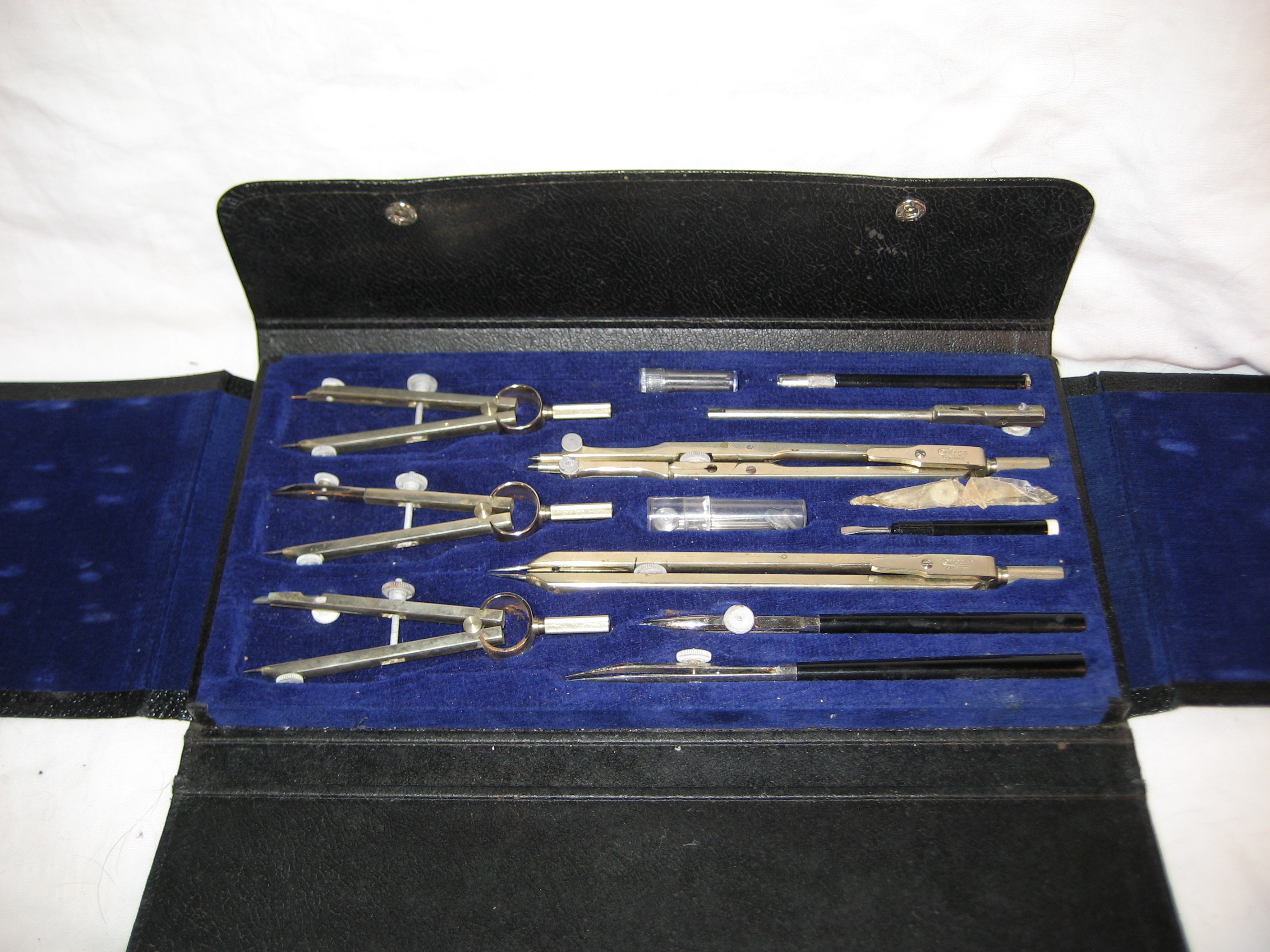 Plastic capsule holding extra leads is full and untouched as is the capsule of extra point tips, screws and thumbscrews. Two mechanical pencils (assume silver plated or painted)show some peeling. Small rust spots appear on the three compass "rings" (see photo).