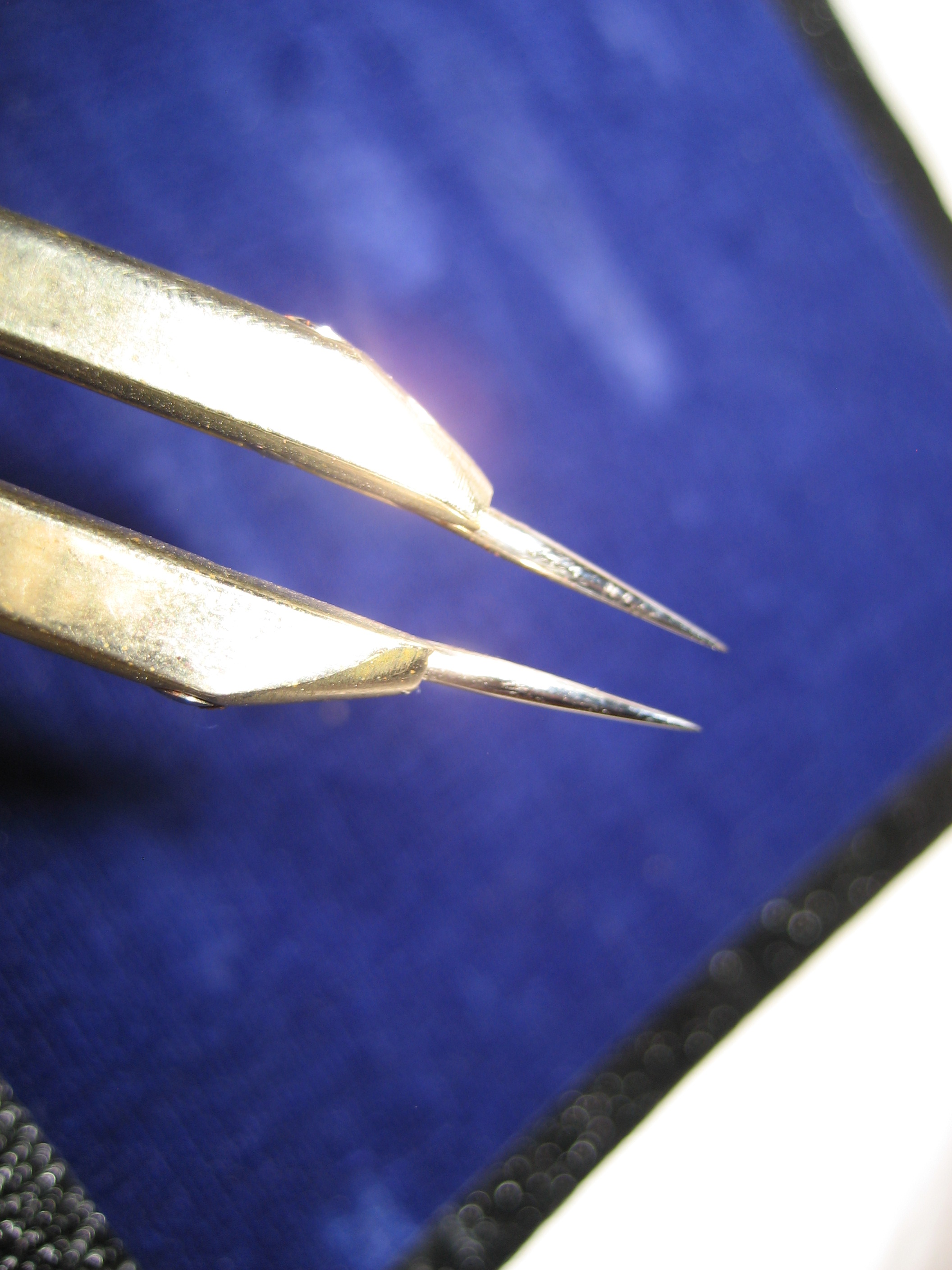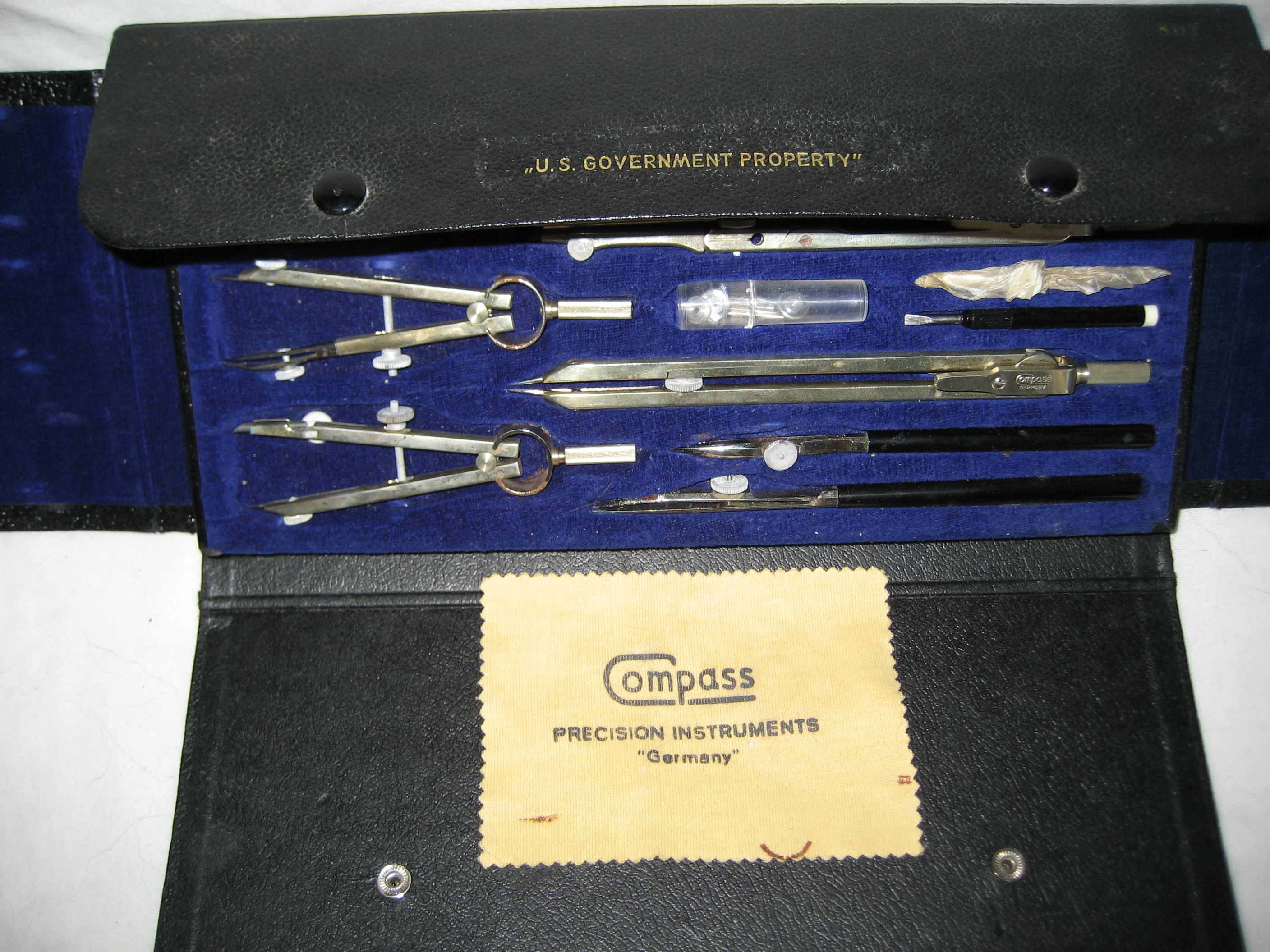 All instruments are stamped with Compass/Germany. Instruments are clean and very sharp. This set appears to have been little-used from the complete lack of wear and tear on the inlay mold holding the instruments as well as the velvet covering and outer case. The faux leather is in excellent condition with one 'ding' on lower left corner. Snaps are like new. Still has the polishing rag marked ComPass Precision Instruments "Germany".
