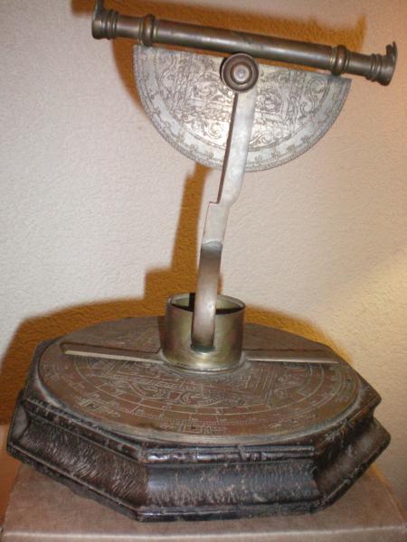 Carved bronze base with Dedicatua E Medici in the outer circle. The circle has numbers in 10's from 0 to 90 and back again. Inside the circle is a square, with scrolls around it. Each side of the square has numbers 12, 8, 4, with a hard line and then 4, 8, 12 on the same side of the square. Attached to the base is a center (painted) compass inside a bronze basket with blades that are attached, which move in a circle over the bronze plate. Attached to it above is a perpendicular half circle with a viewer attached to the very top with view finder on both ends