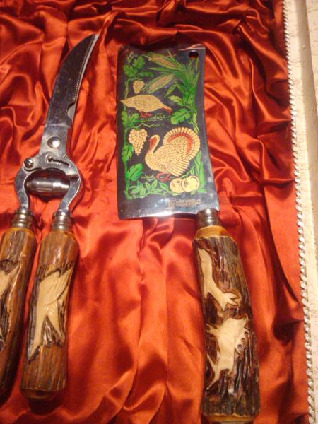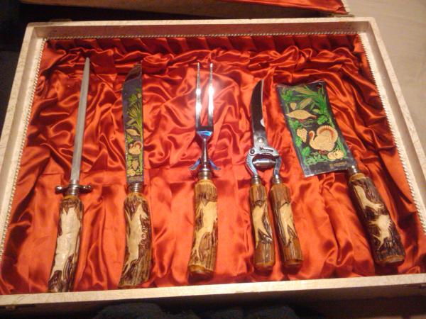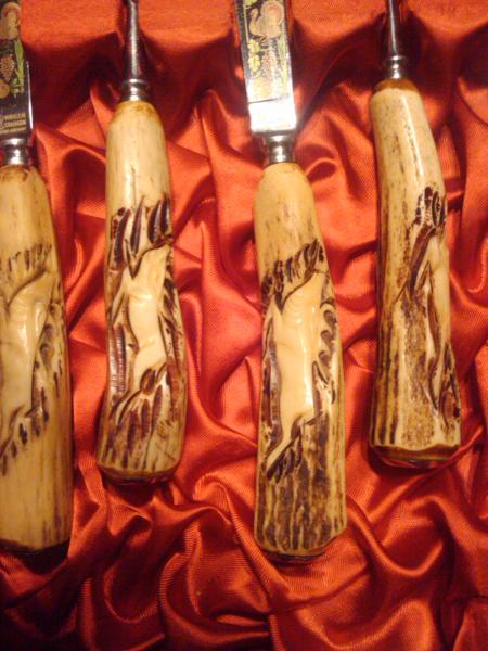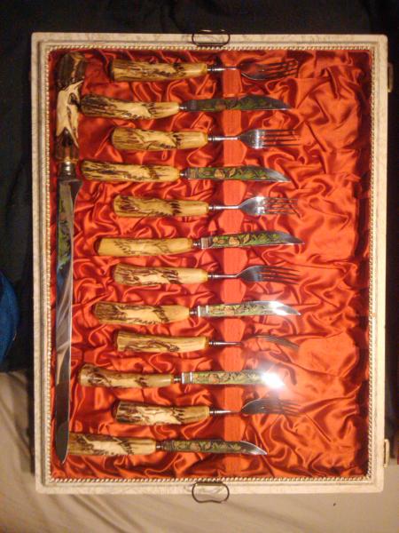 Sadly we do not not much about this item. It was given to my fiance from his grandmother. Each handle is hand-carved. She said it was ivory, but we aren't sure of that. The metal is decorated and it is in the original box. Several pictures are attached for better description.