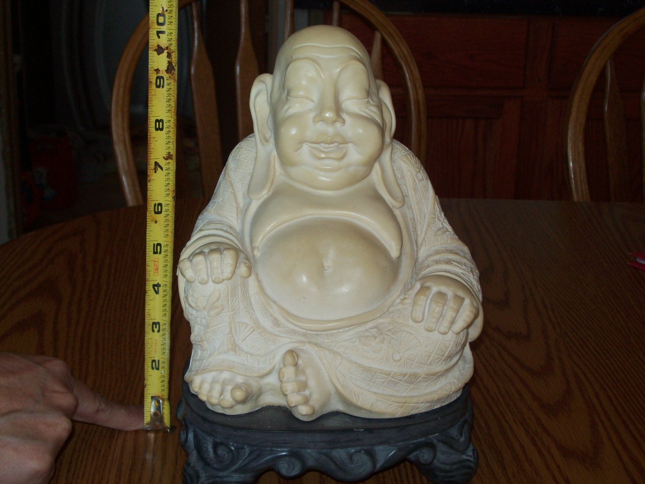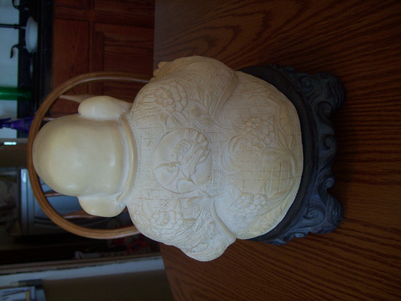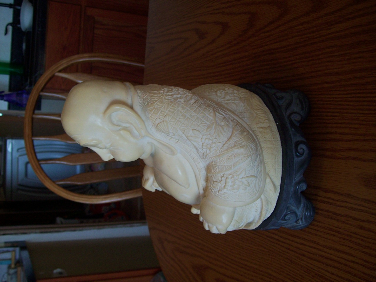 composition seated figure of hotai dating from the mid-20th c. is the most solid information we have. He has a dragon on his robes in the back. A few different kinds of flowers carved on him. A what appears to be a marble base. We are not sure what the top of him is made from. The is writing on the underside of his base but we do not know what it says.