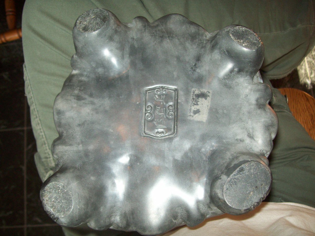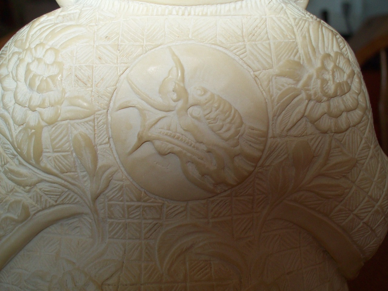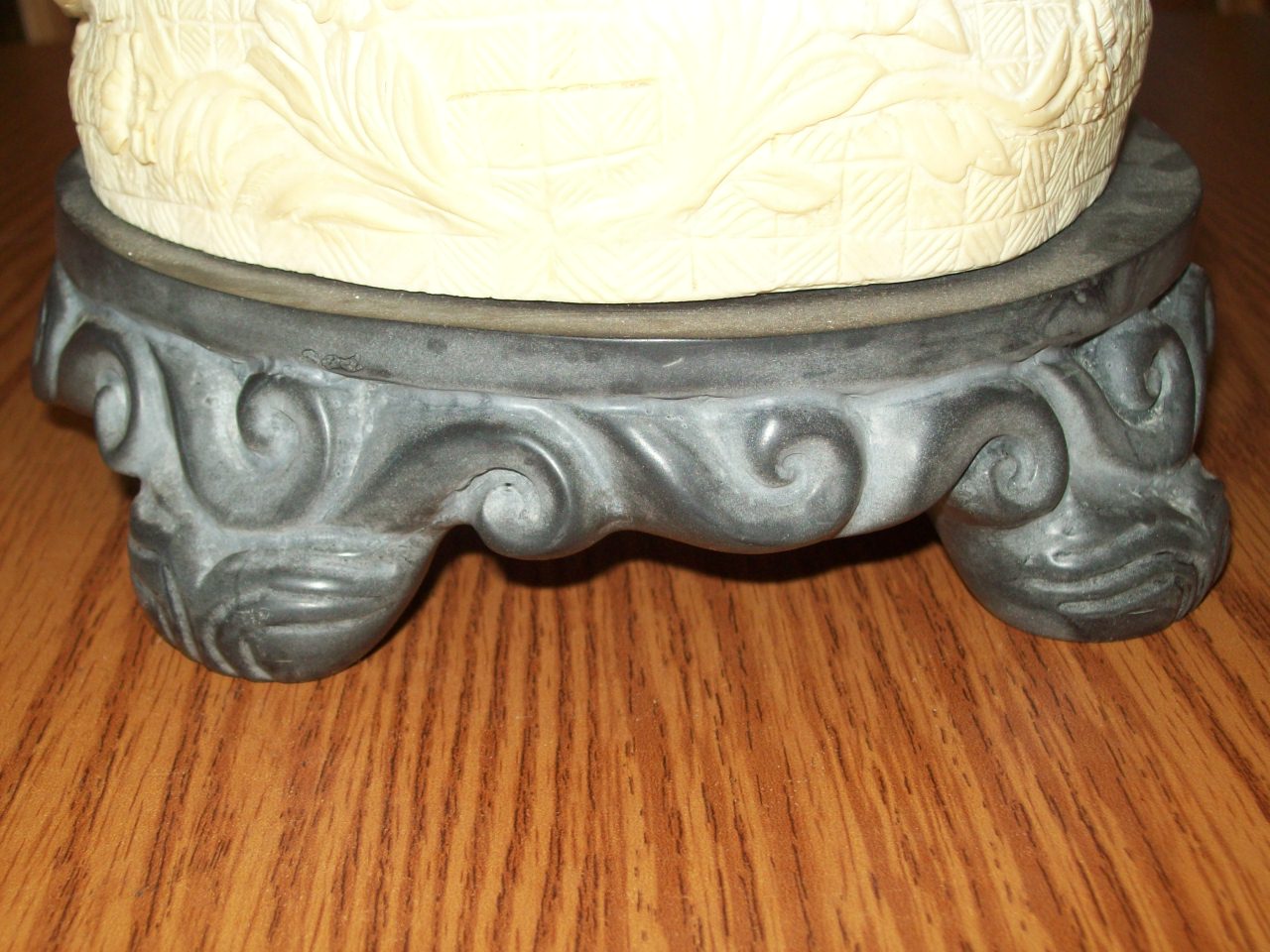 composition seated figure of hotai dating from the mid-20th c. is the most solid information we have. He has a dragon on his robes in the back. A few different kinds of flowers carved on him. A what appears to be a marble base. We are not sure what the top of him is made from. The is writing on the underside of his base but we do not know what it says.