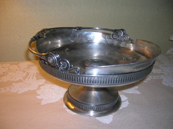 This is a beautiful pedestal type compote or basket. It has a handle with cutwork design and etched pelican? or bird and vine in the raised center of the inside. It makes a beautiful centerpiece with fruit or decorative balls. Used many times with silver candlesticks and very much admired.