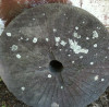etched 77 or LL on face; concentric grooves on both faces; circular indented erosion with iron residue around center; includes iron spindle type hardware; the outer edge has some chips