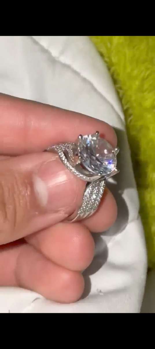 Physical Description: This ring features a prominent central stone, likely a cubic zirconia or a similar synthetic gemstone, set in a silver-toned metal band. The band has a twisted design with small accent stones, possibly diamonds or additional cubic zirconia, enhancing its sparkle. The ring appears to be a size 7, suitable for an average finger size.