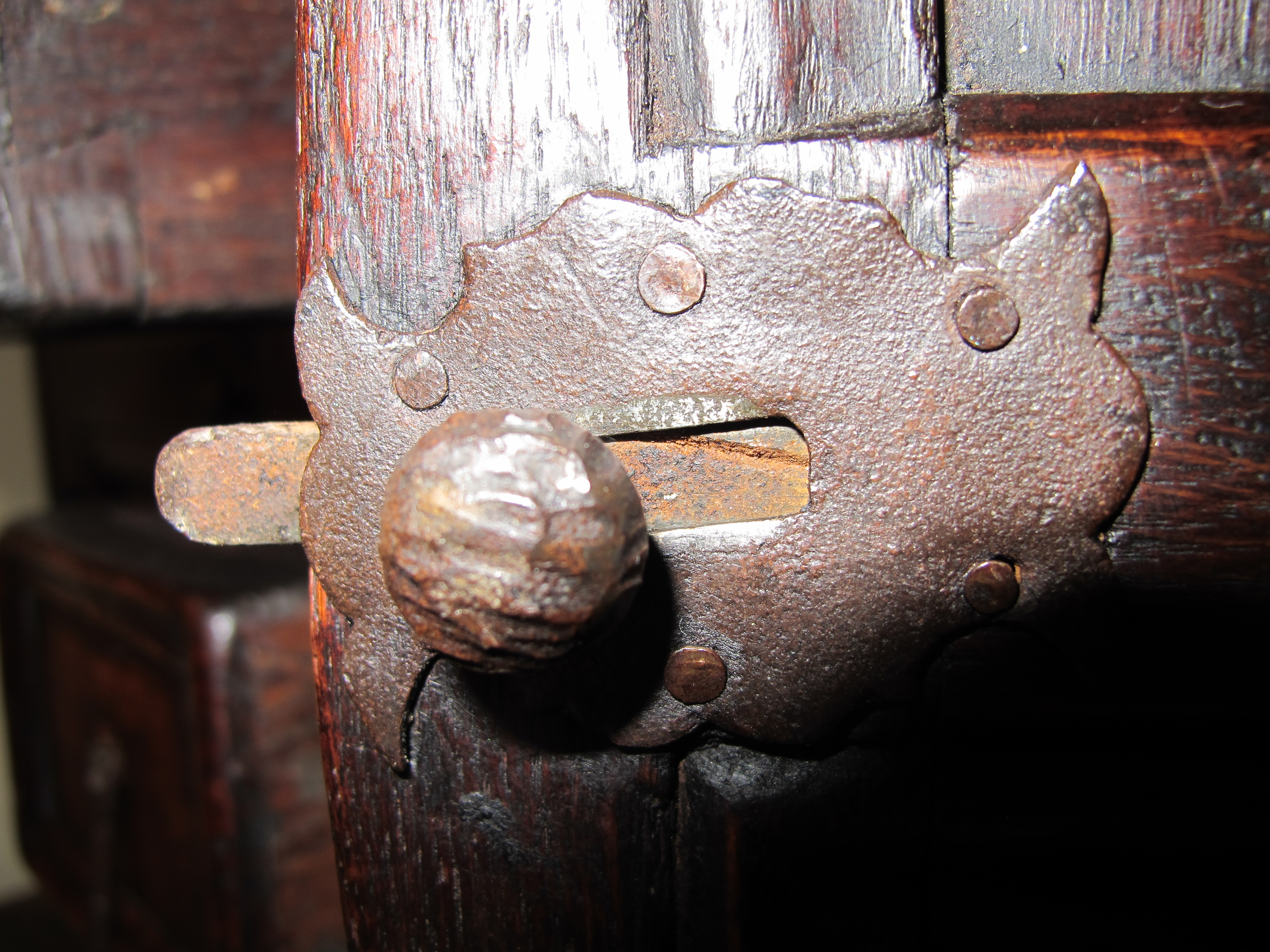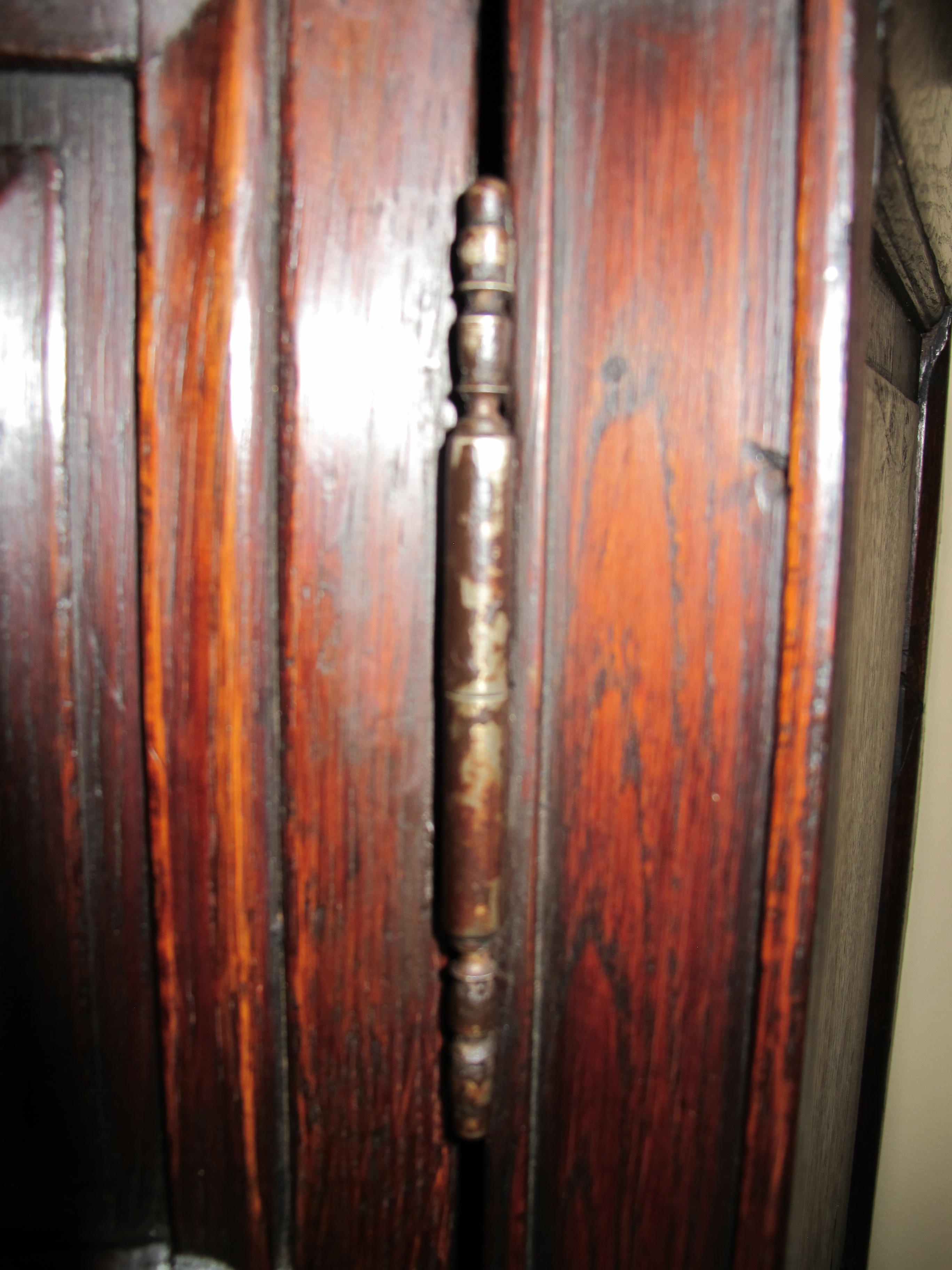 The hinges of the doors are very uniqe and look old. On the inside, these are attached with two flat-head screws to both the cabinet and the door itself. I was initially concerned about the flathead screws, but have since found that screws began to be produced in the US around 1760. There is a single wooden shelf in the center of each cabinet behind each door held up with a wood brace on each side.