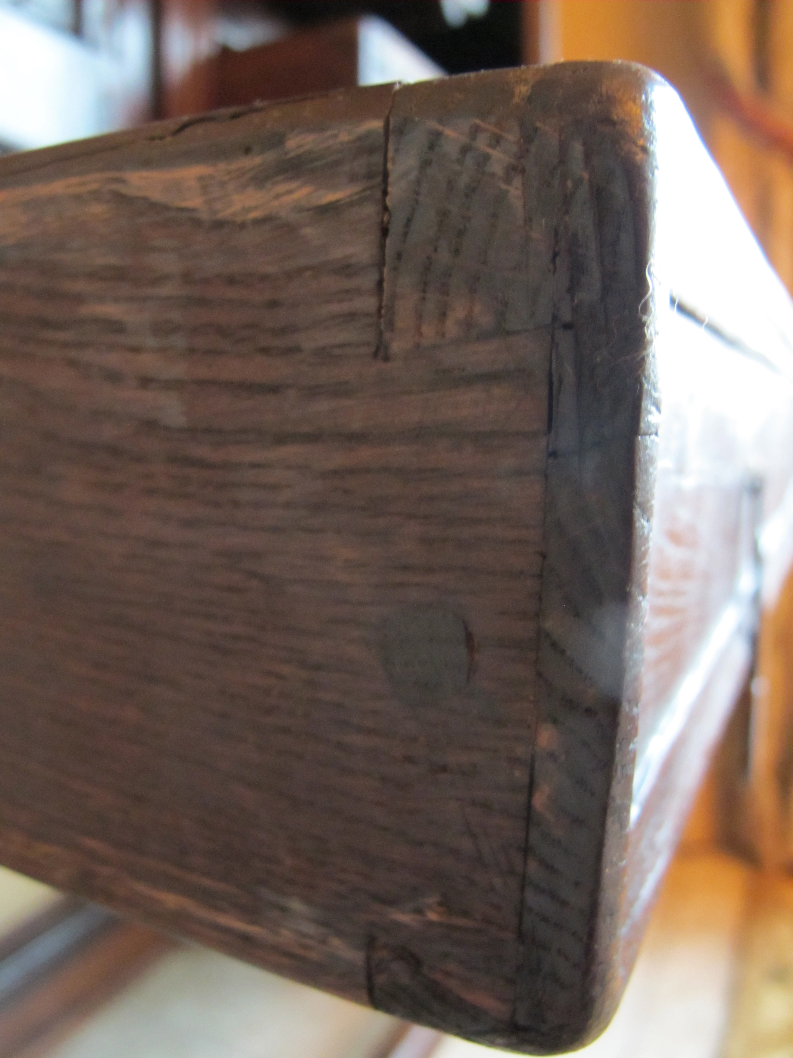 Ok, I pulled the drawers out and took some additional pictures of the dovetails on both front and back. They are definitely not smooth. One drawer has a crack in the bottom. The pulls seem to be attached with a strap that goes through the front of the drawer and folds back behind the front of the drawer, so it looks like a cotter pin, only flat. There is a picture attached of this too. When I look on the inside of the cabinet after pulling out the drawers, I can see an area where there appears to be no or little stain, perhaps the cabinet was re-stained at a later time, but does not look like it was done anytime recently. I'm not sure how I attach new photos, I'll save after entering text and then attempt to edit the post and add the new pictures. Thanks for looking and responding Phoenixguy