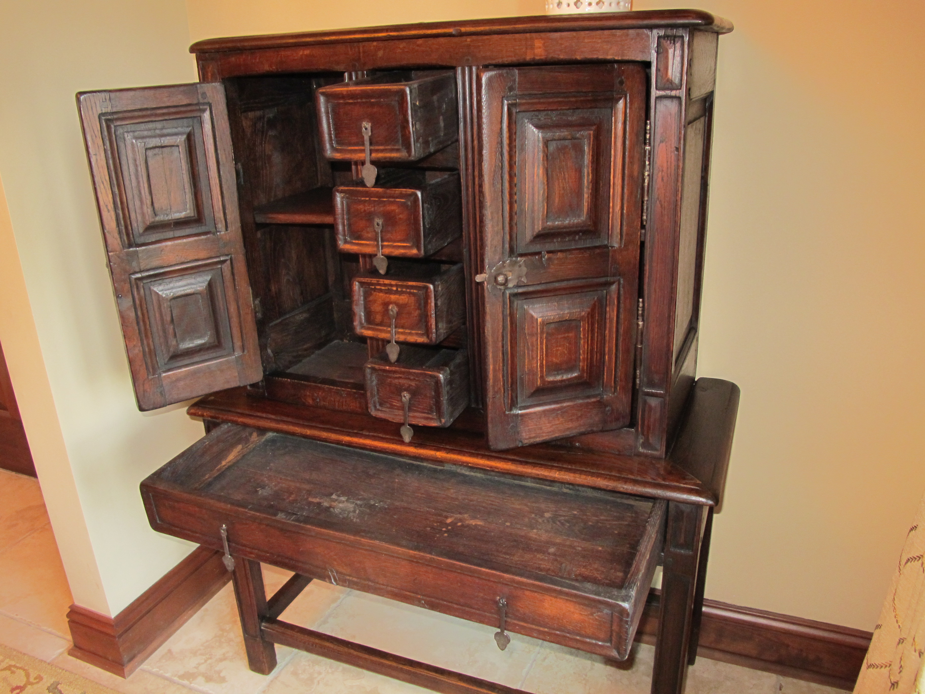 Continental 18th Century cabinet on stand. This appears to be made of oak or walnut with a very dark stain. The cabinet consists of four small drawers positioned vertically in the center of the cabinet with two cabinet doors, one on each side of the four drawers. The hardware is very unique. The drawers each of a flattened metal pull to open them. The pulls are fastened to the drawers through a small hole with a flattened piece of steel, looped through the hole and spread out on the inside of the drawer (see photo). The cabinet doors have a knob, which you move away from the drawers to unlatch and then pull to open. Hardware appears very old as does the wood itself. The joints of the drawers are not traditional dovetail, but there is a small joint at top, then a large dovetail type joint of the side piece of the drawer, and then another small piece from the drawer front. There appear to be no nails used in making this cabinet, only square wooden pegs. The cabinet sits on a matching stand which also has one drawer the entire width of the stand and four legs with bracing between them. This is very sturdy and solidly made. The inside of the cabinet doors appears to have the same molding design as on the outside. There are various small dings, nicks, etc. There are no identifying marks on either piece. Both are very heavy and solid. When removing the drawers, some of the bottoms have cracks and separation. The joints of the drawers are not smooth, but rough where the pieces meet.