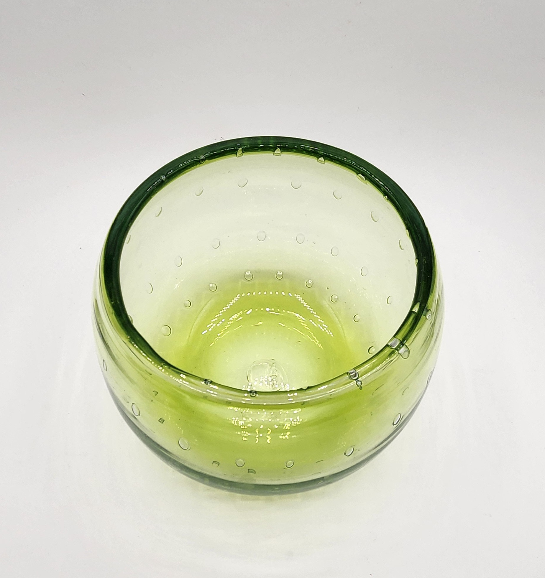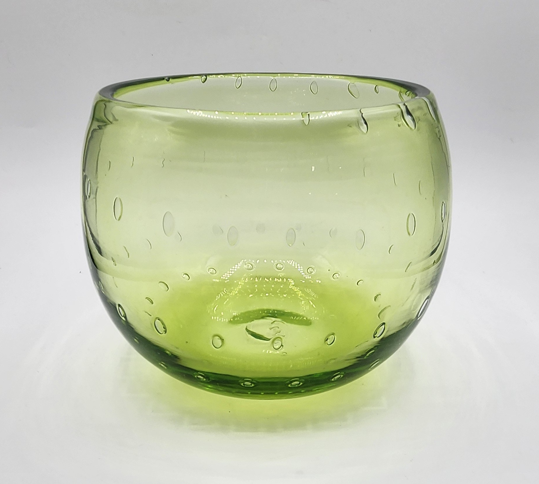 Joel Philip Myers is a celebrated designer known for his innovative work with Blenko Glass. His designs from the 1960s and 1970s are highly collectible, especially those that showcase technical mastery, such as controlled bubble patterns. The #7039 bowl is iconic of his work and represents the fusion of artistic craftsmanship and functional design, typical of Blenko's mid-20th-century production.
