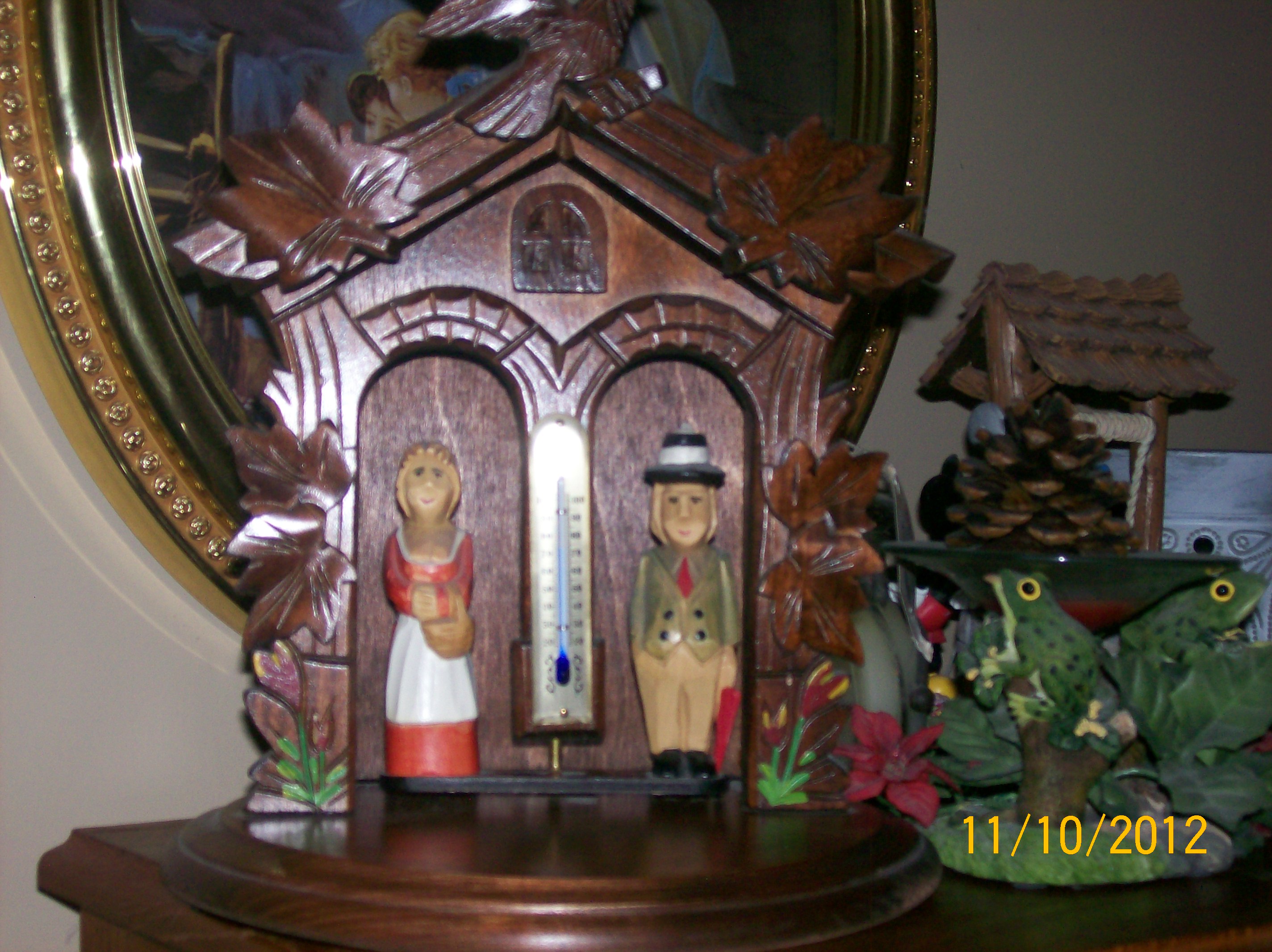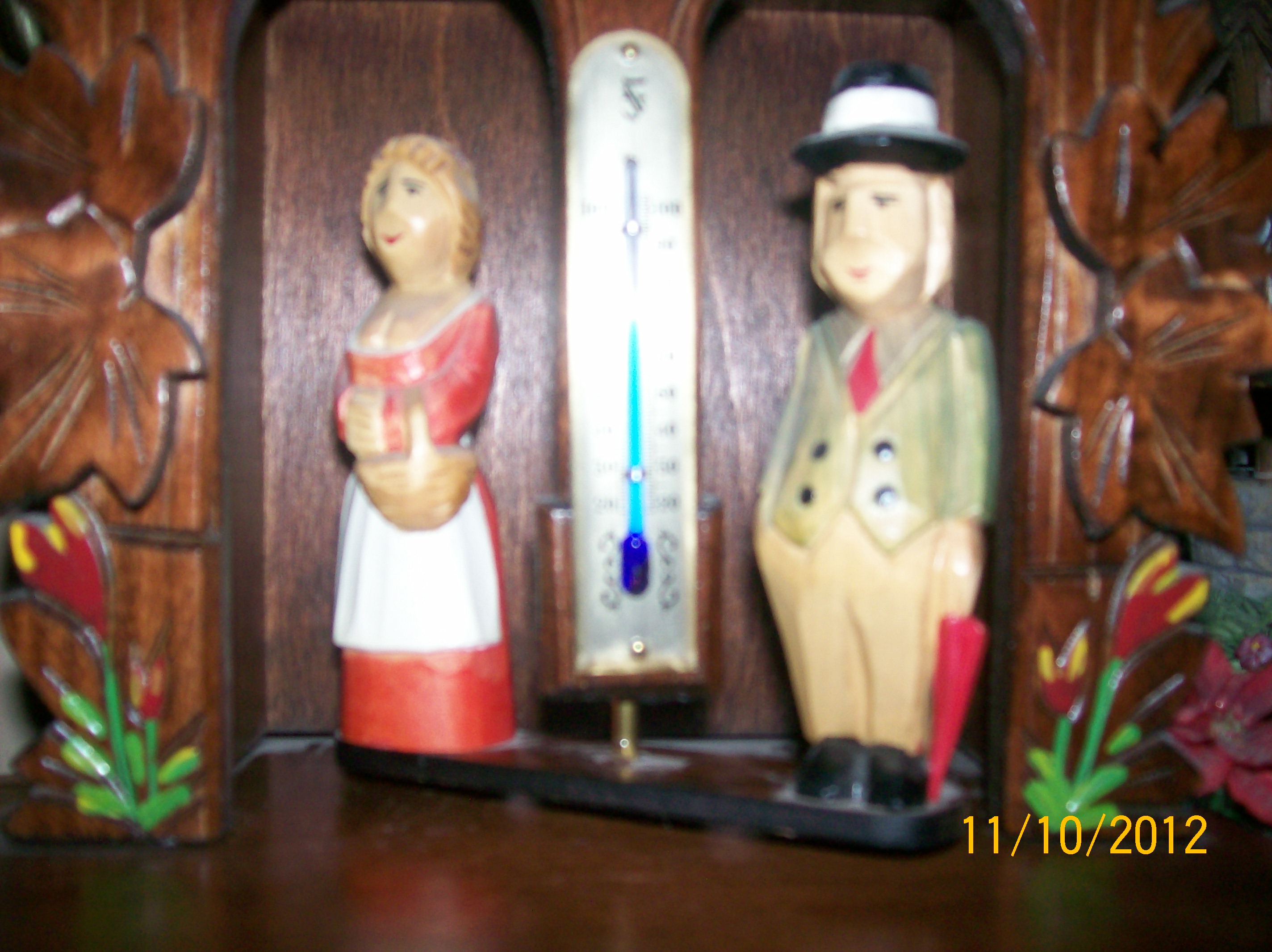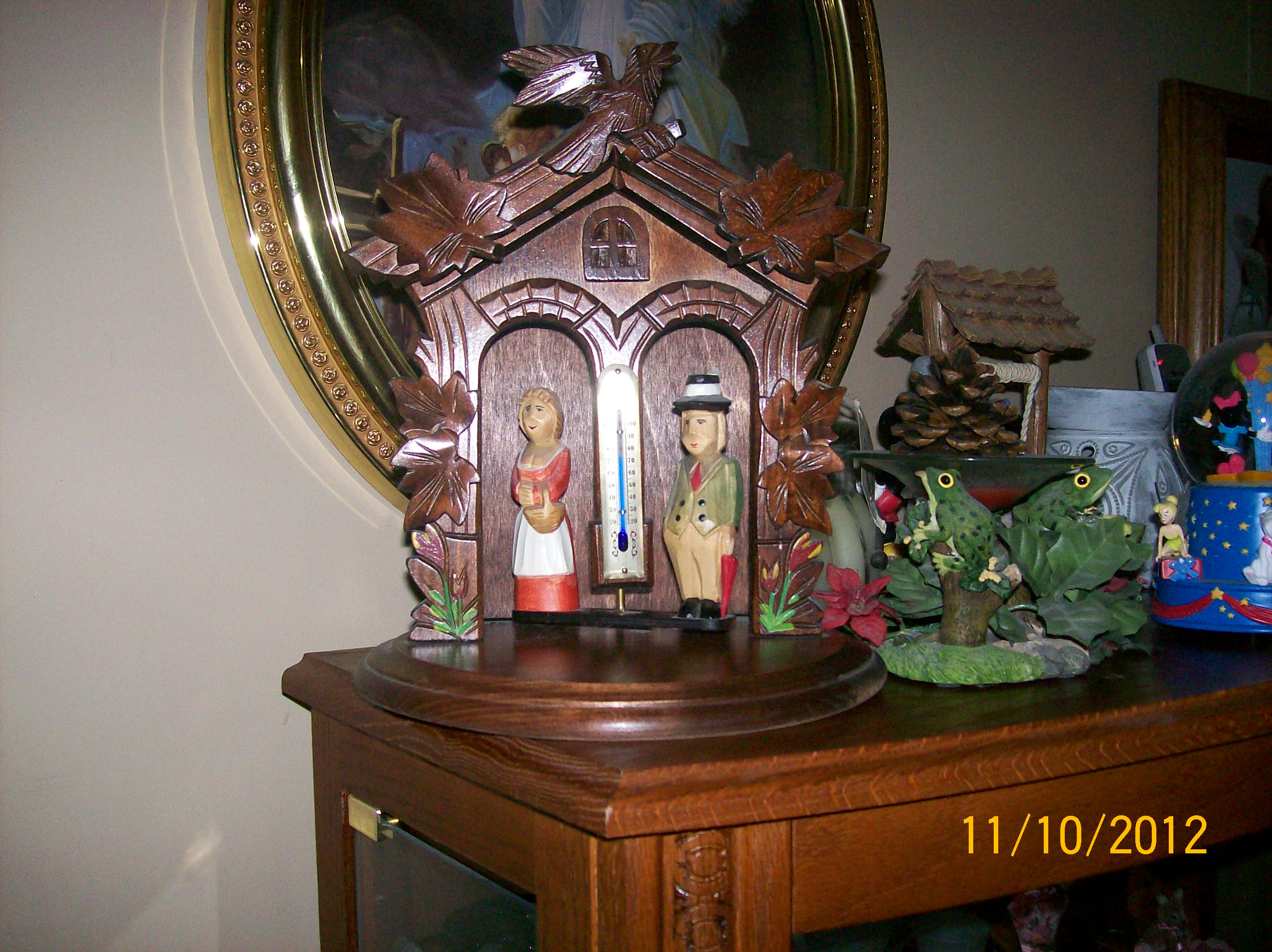 Old German Coocoo Clock looks hand made, in excellent condition. My friends mom had it serviced regularly to keep it in proper working order. Has not only the cooco bird that pops out on the hour and half hour, but a carosell of people that goes around and around as well. Very neat clock! Plays a really nice tune as the people carosell around. There is another piece that goes with it that has a thermometer and two hand carved people on either side on another carosell, not sure what it goes to, just know it is part of the cooco some how. Any information about these two items would be greatly appreciated.