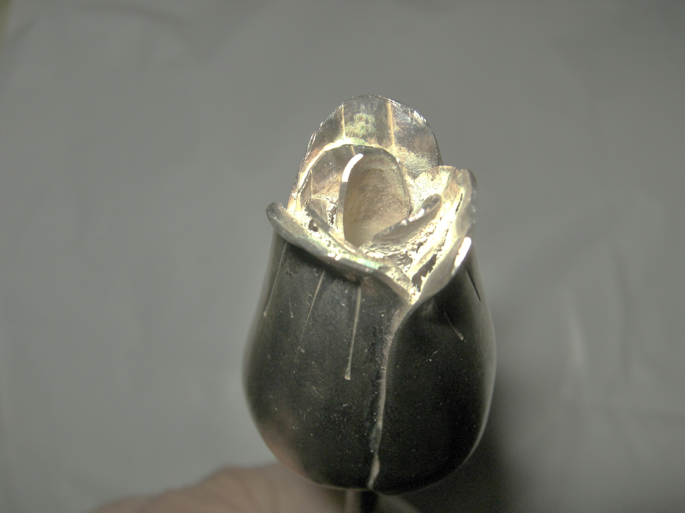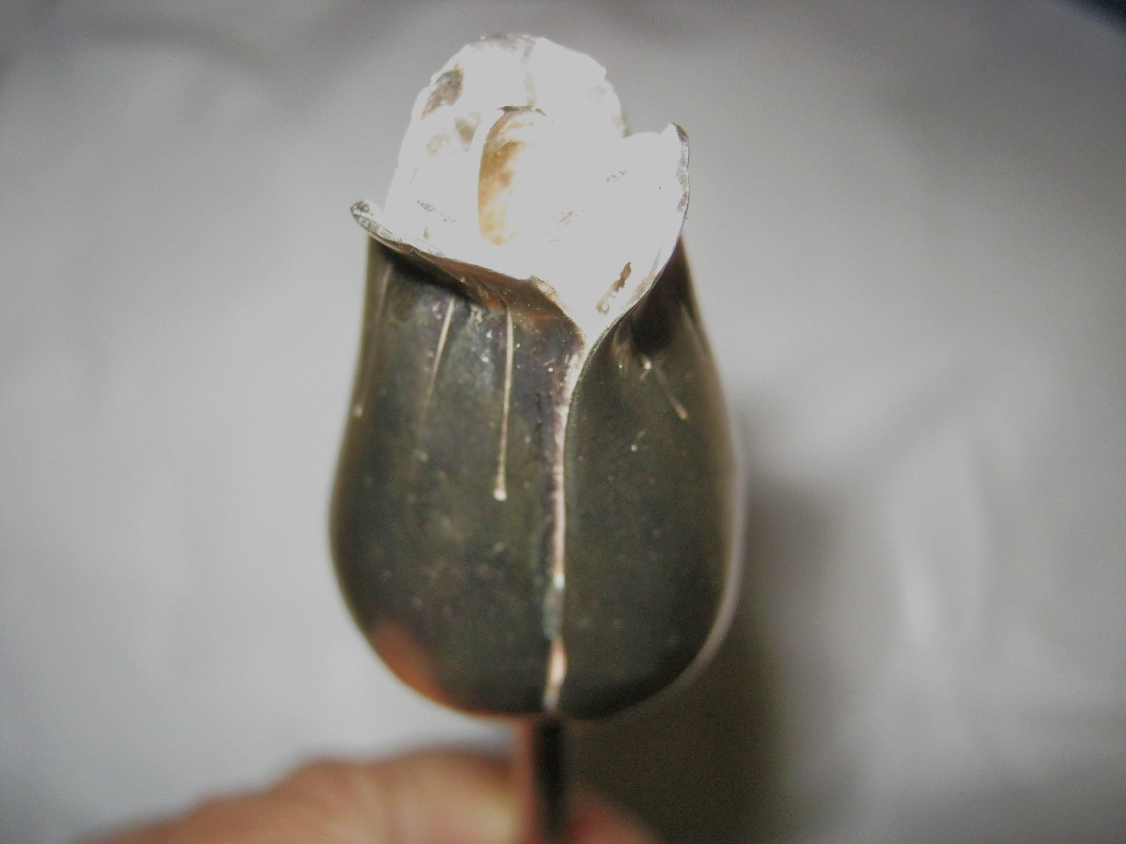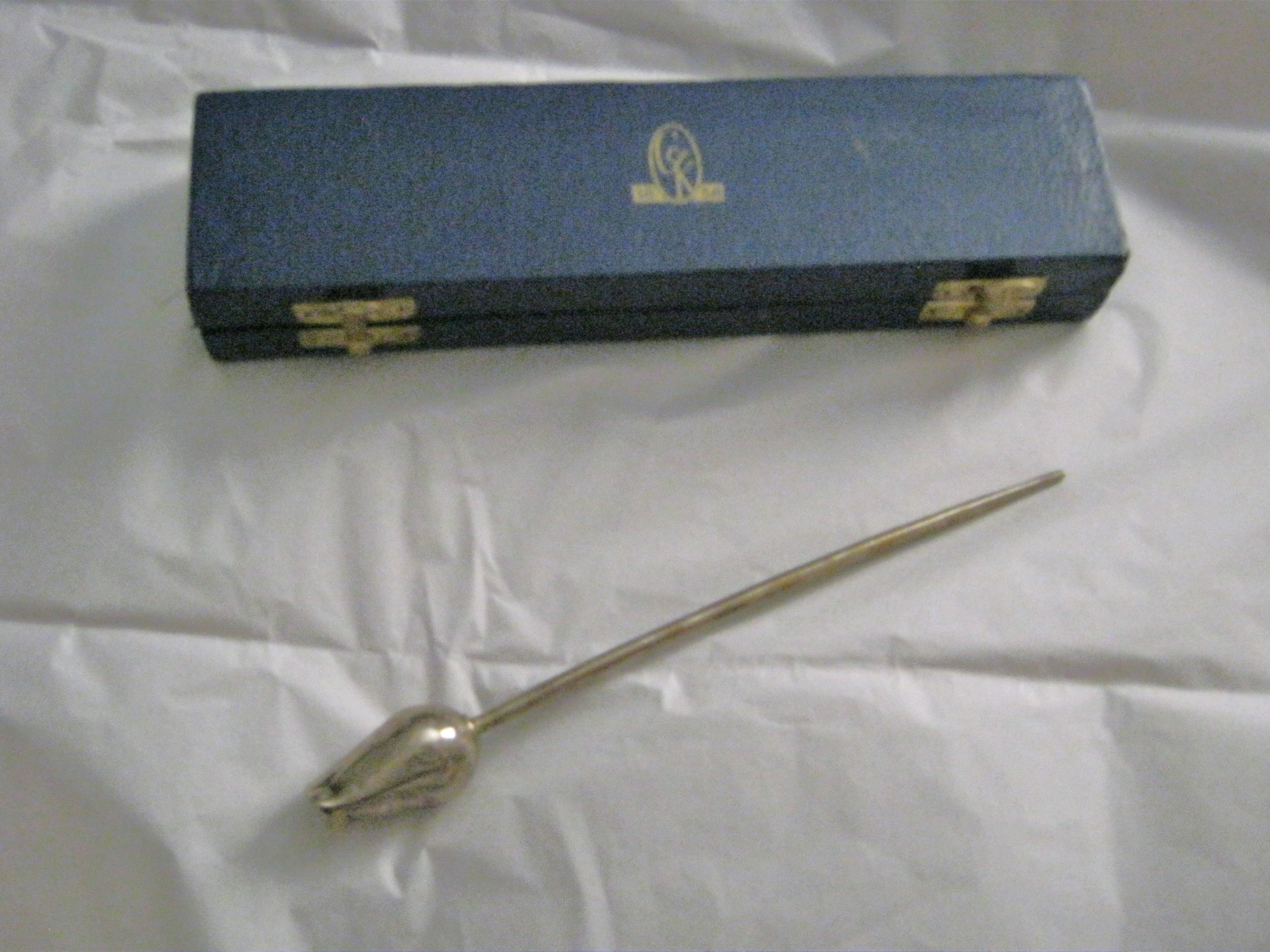 This is a thrift store find. The rose came in this box but I could not find a hallmark on the rose. It is 8.5" long. It weights about 65g. I know a little about the company but nothing about the rose, age, function. Any information would help. I have not cleaned it. A magnet will not stick to it. No other testing has been done