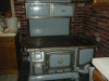 this piece comes apart in sections and sits on a base that looks like a old tub, has all it' parts and in good condition. is a cream and trimmed in the peach has the horn of plenty with fruit in it and black accents. only a few chips in the paint but all in all good condition. the oven section is very heavy and took 3 men to load. full size range, I would guess close to 400lbs.