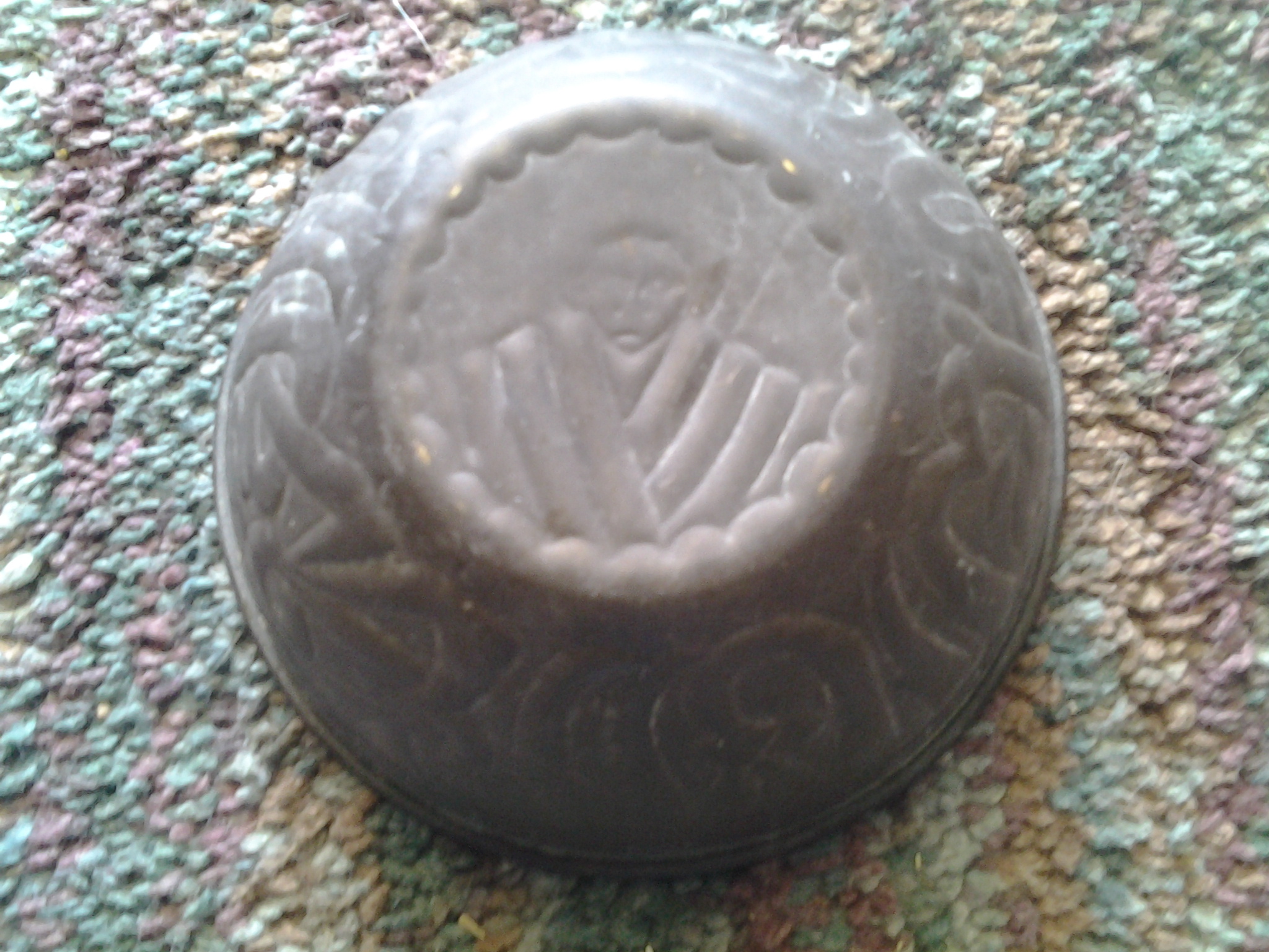This bowl was found in West Central New Mexico in early 1970's stuck in a crevice of a mountain, barely noticeable. The "person" stamped out in bottom of the bowl "appears" to have a turban on & wearing a robe, as though of royalty., & I'm not sure, but the design around the bowl looks as though it may be foreign language.