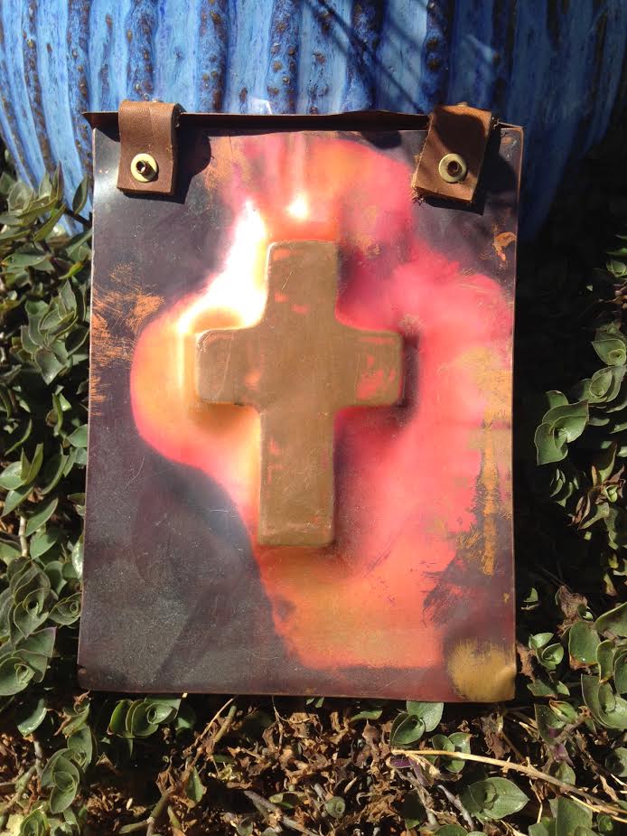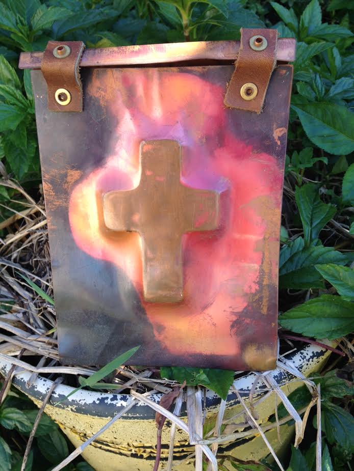 This was found in a box of things purchased from an old estate sale. 2 copper pieces attached with leather straps and a cross on front. I haven't been able to find anything comparable to know it's value or even it's purpose. Is it some type of book cover ? I am at a loss :)