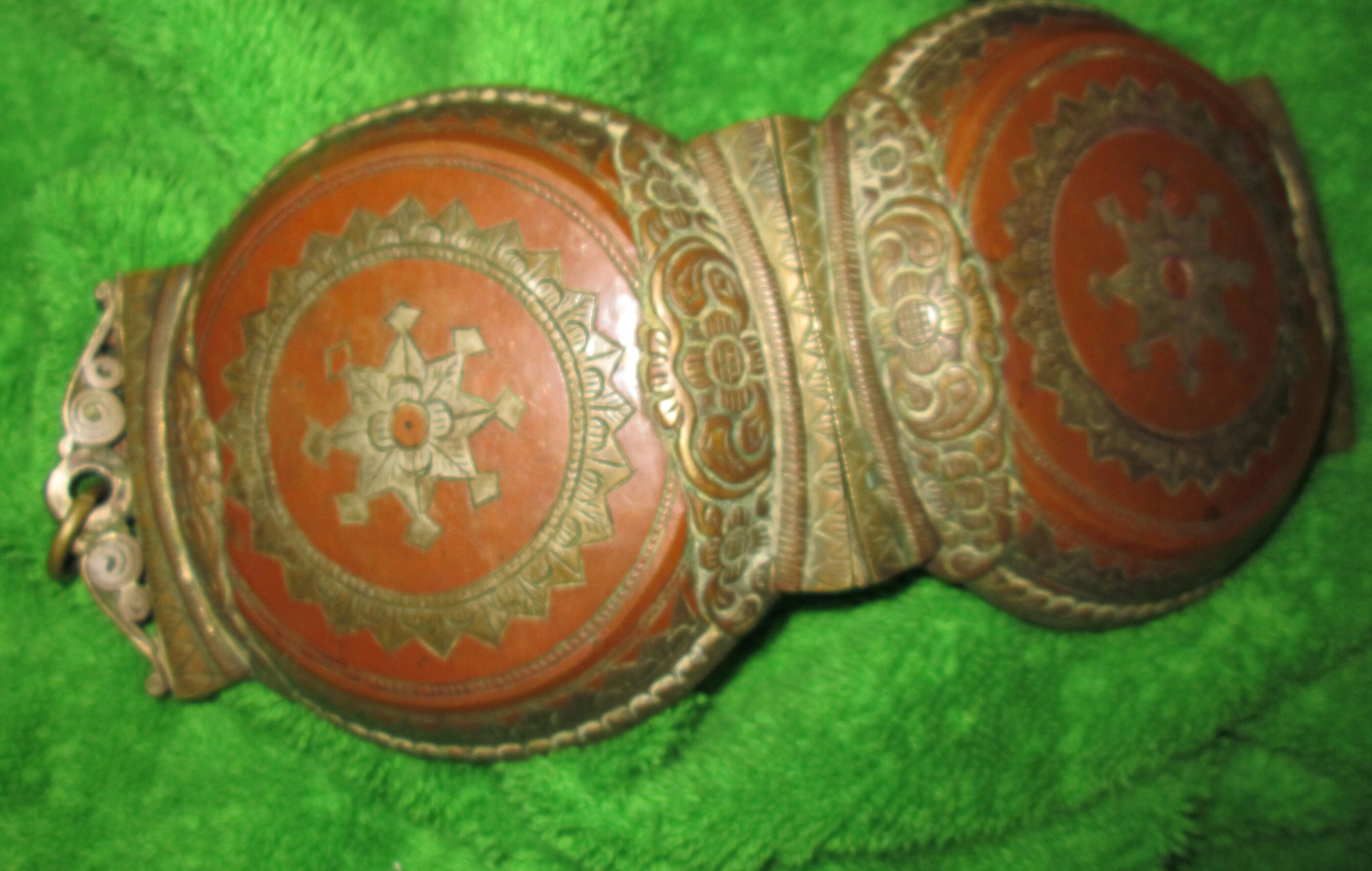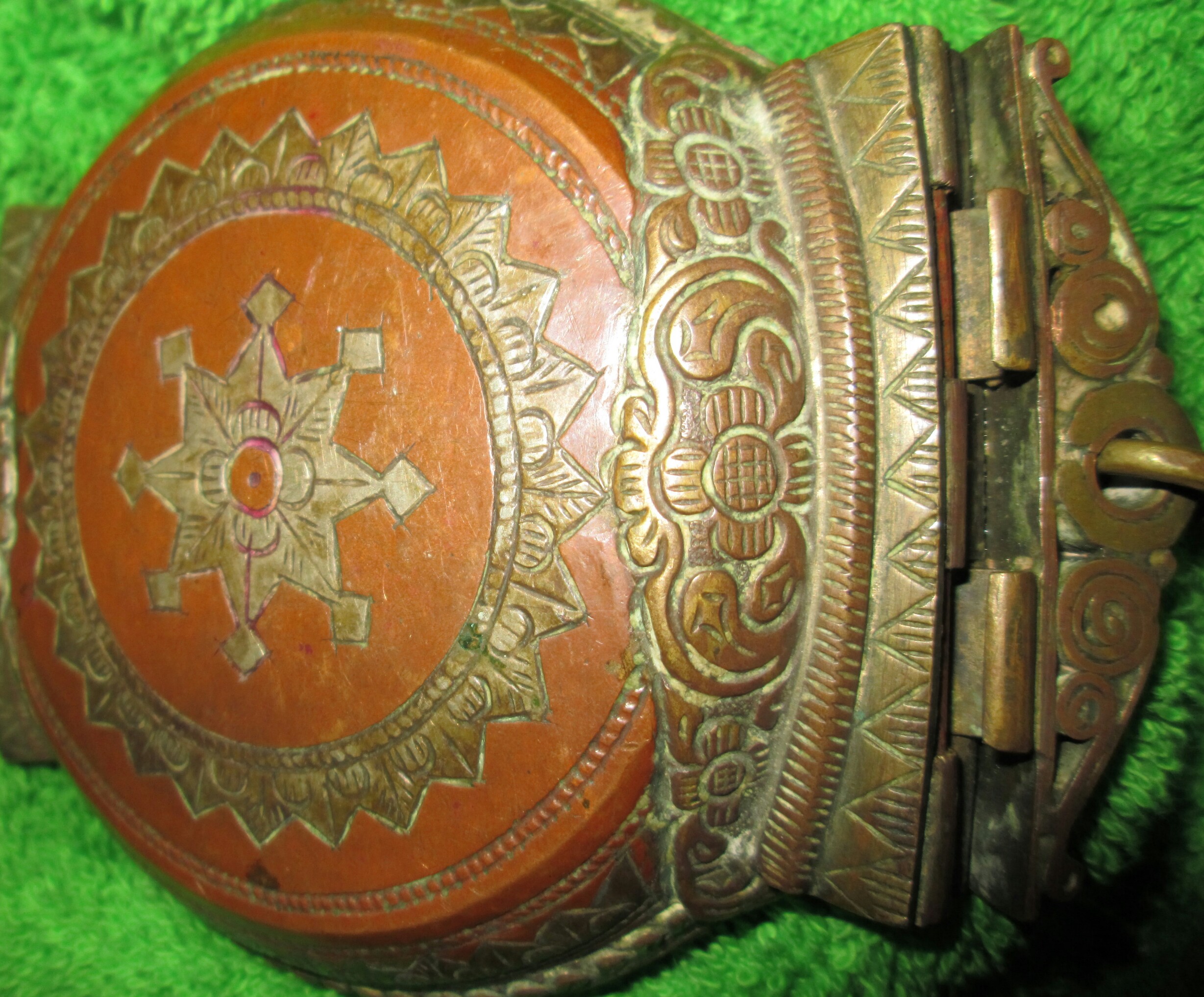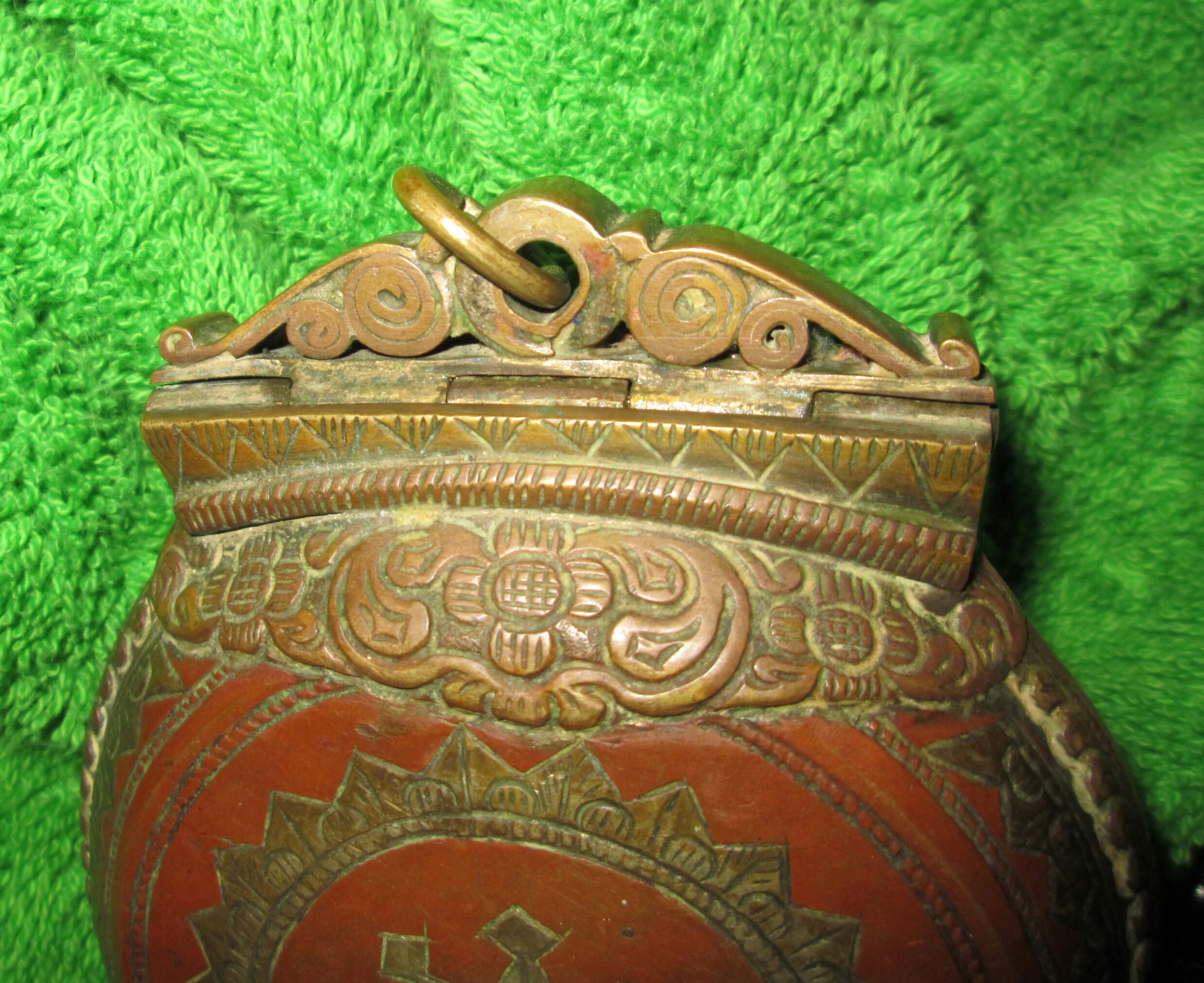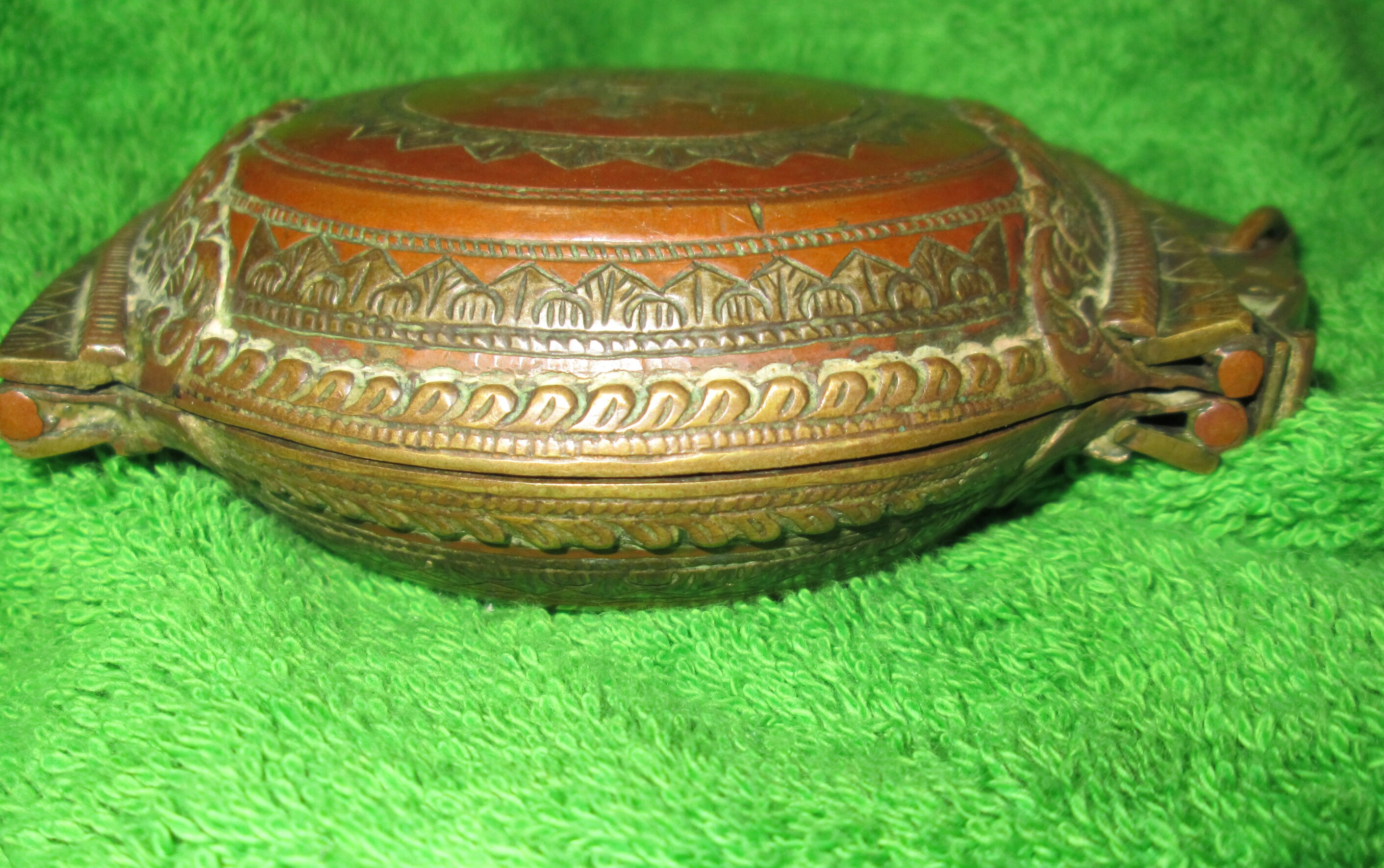 5inx4inx1 copper container has brass inlay over intricately sculpted crested latch.