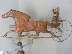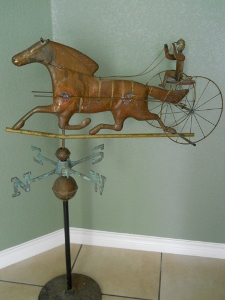 This was purchased at an estate sale many years ago. I would like to know if this is a true antique horse and sulky weathervane, circa, and worth. To my eye, it looks very old... but knock offs are very good at imitating age. I haven't found any hallmarks on it. It seems to be in very good condition. Both pieces are quite heavy. I'd say 20-30lbs together.